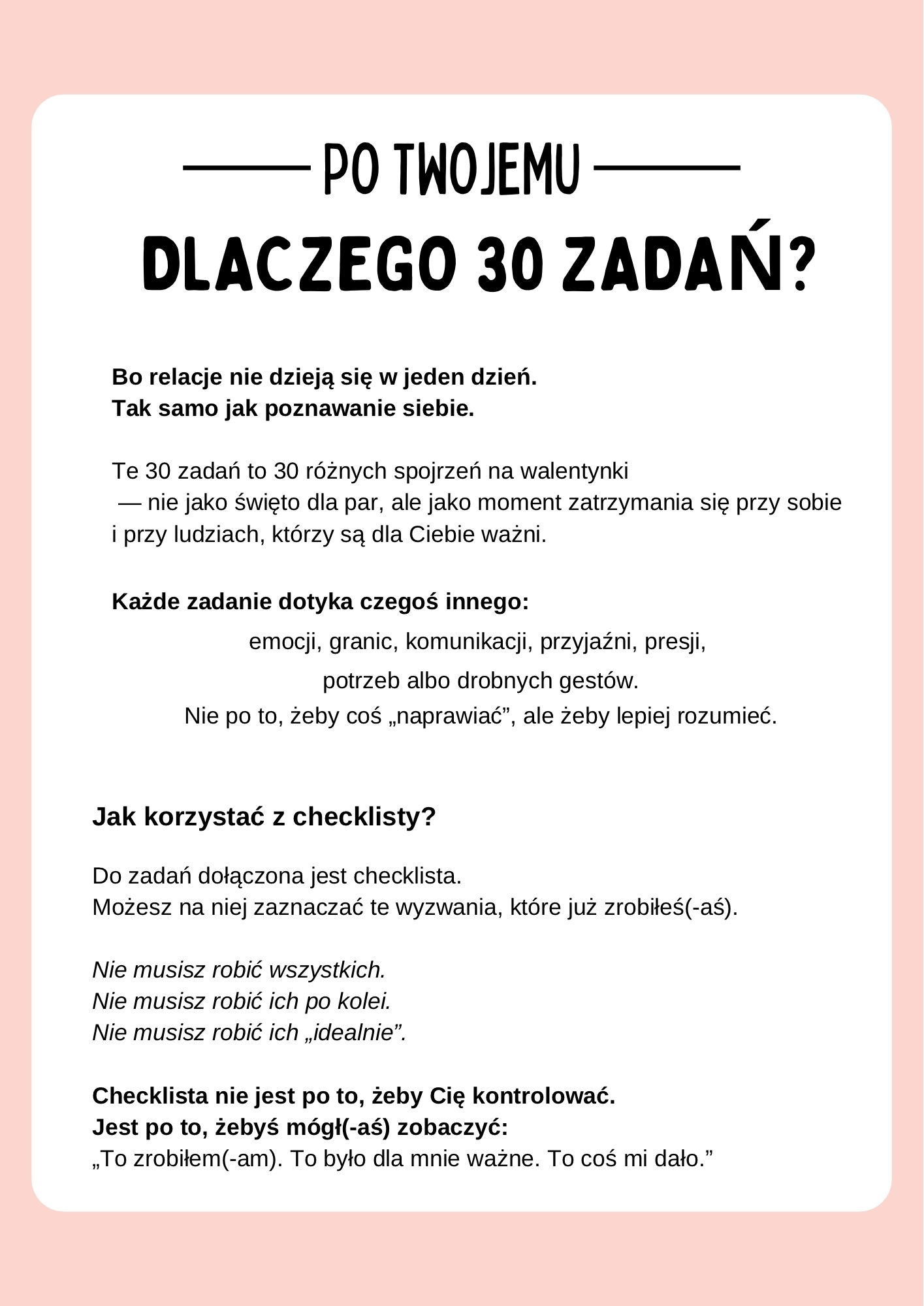 Zadania można realizować w dowolnej kolejności, wracać do nich i dostosowywać do siebie. To nie jest program „naprawczy” ani test. To bezpieczna przestrzeń do myślenia, pisania i zauważania siebie.