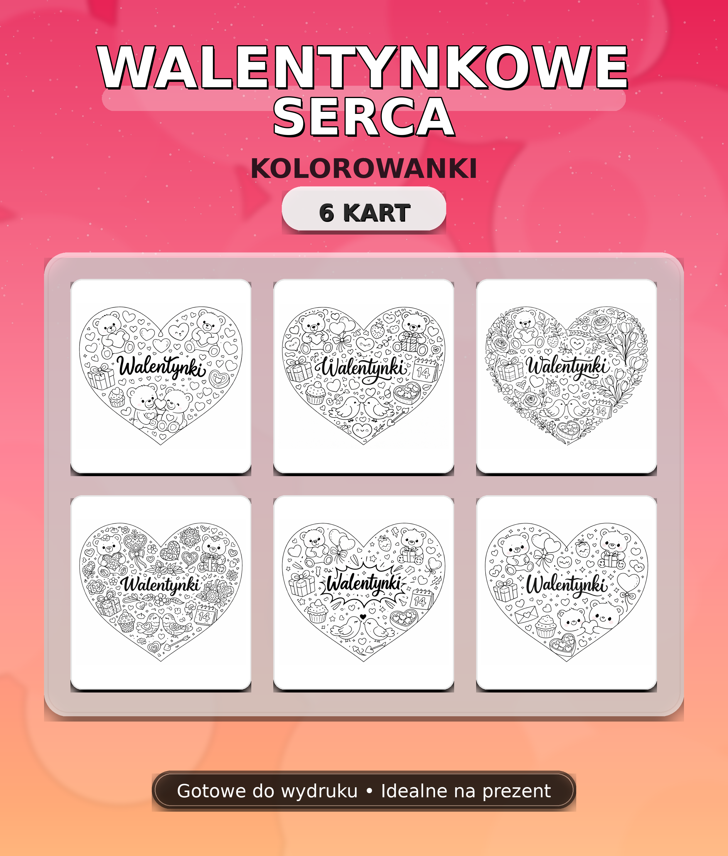 Zawartość pliku: 6 różnych dużych serc do kolorowania z napisem „Walentynki”; w środku serc: urocze, walentynkowe motywy (m.in. misie, ptaszki, prezenty, kwiaty, słodkości, symboliczna data „14” itp.); czarno-białe grafiki przygotowane do wydruku i kolorowania. Odbiorcy: przedszkole (5–6 lat) oraz edukacja wczesnoszkolna (klasy 1–3); do wykorzystania w szkole, przedszkolu, świetlicy, terapii ręki lub w domu. Umiejętności, które rozwija materiał: motoryka mała (usprawnianie dłoni i palców, chwyt narzędzia pisarskiego), koordynacja wzrokowo–ruchowa i precyzja, koncentracja i wytrwałość w wykonywaniu zadania, kreatywność (dobór kolorów, wzorów, dodatków), sprawność grafomotoryczna – przygotowanie do pisania (kontrola nacisku, kierunkowość ruchu). Jak pracować z materiałem – krótka instrukcja: wydrukuj wybrane strony (najlepiej na grubszym papierze), ustal zasady: kolorujemy całość lub tylko wybrane elementy; można dodać limit kolorów albo „kolorowanie według kodu” (np. 3 kolory), dzieci kolorują kredkami/mazakami; starszym można zaproponować cieniowanie, wzorki, wypełnianie tła, gotowe prace wykorzystaj jako: dekorację sali/gazetki, serce–kartkę walentynkową, element wystawy lub pracę do teczki ucznia; wariant grupowy: każdy wybiera jedną kartę – powstaje galeria „Walentynkowe serca”.