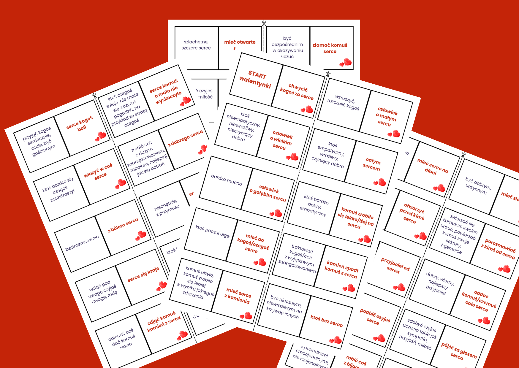 Materiał zawiera 4 strony z 33 karteczkami domina dotyczącymi frazeologizmów związanych ze słowem "serce".