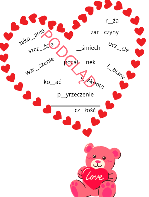 Walentynkowa ortografia zawiera wyrazy w serduszku, które trzeba uzupełnić. Plik przeznaczony głównie dla młodszych uczniów z klas 1-3.