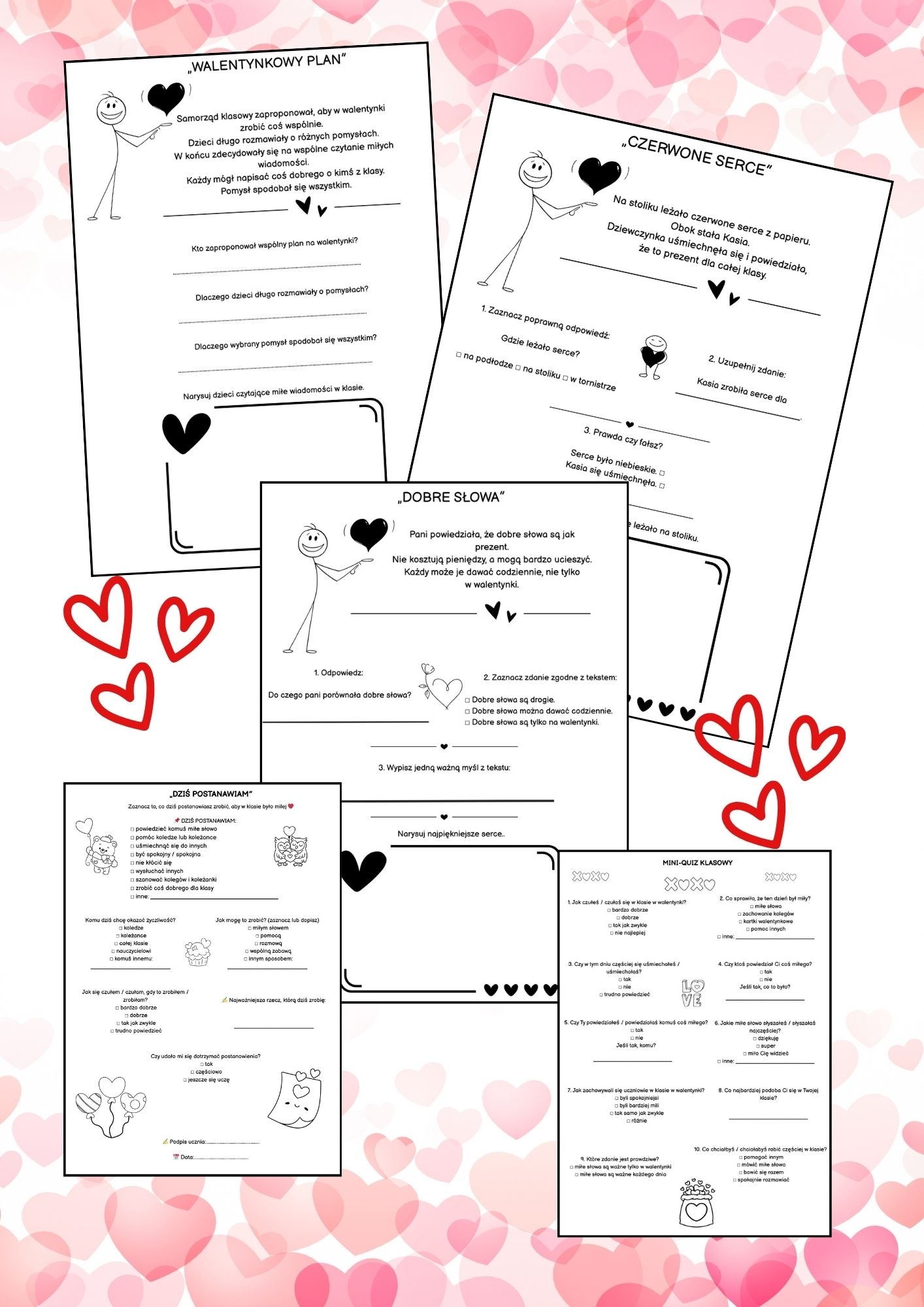 ✔ 45 tekstów walentynkowych dostosowanych do klas 1–3 ✔ 3 różne formy pracy: 15 kart: tekst + quiz ABC 15 kart: tekst + 4 zróżnicowane zadania 15 kart: tekst + inne typy ćwiczeń ✔ rozwija czytanie, rozumienie treści i myślenie ✔ idealny na luty, walentynki, zastępstwa i rewalidację 🎁 BONUSY w pakiecie: karta intencji „Dziś postanawiam” mini-quiz klasowy do podsumowania i rozmowy 📘 Gotowy do druku, przejrzysty i atrakcyjny dla dzieci.