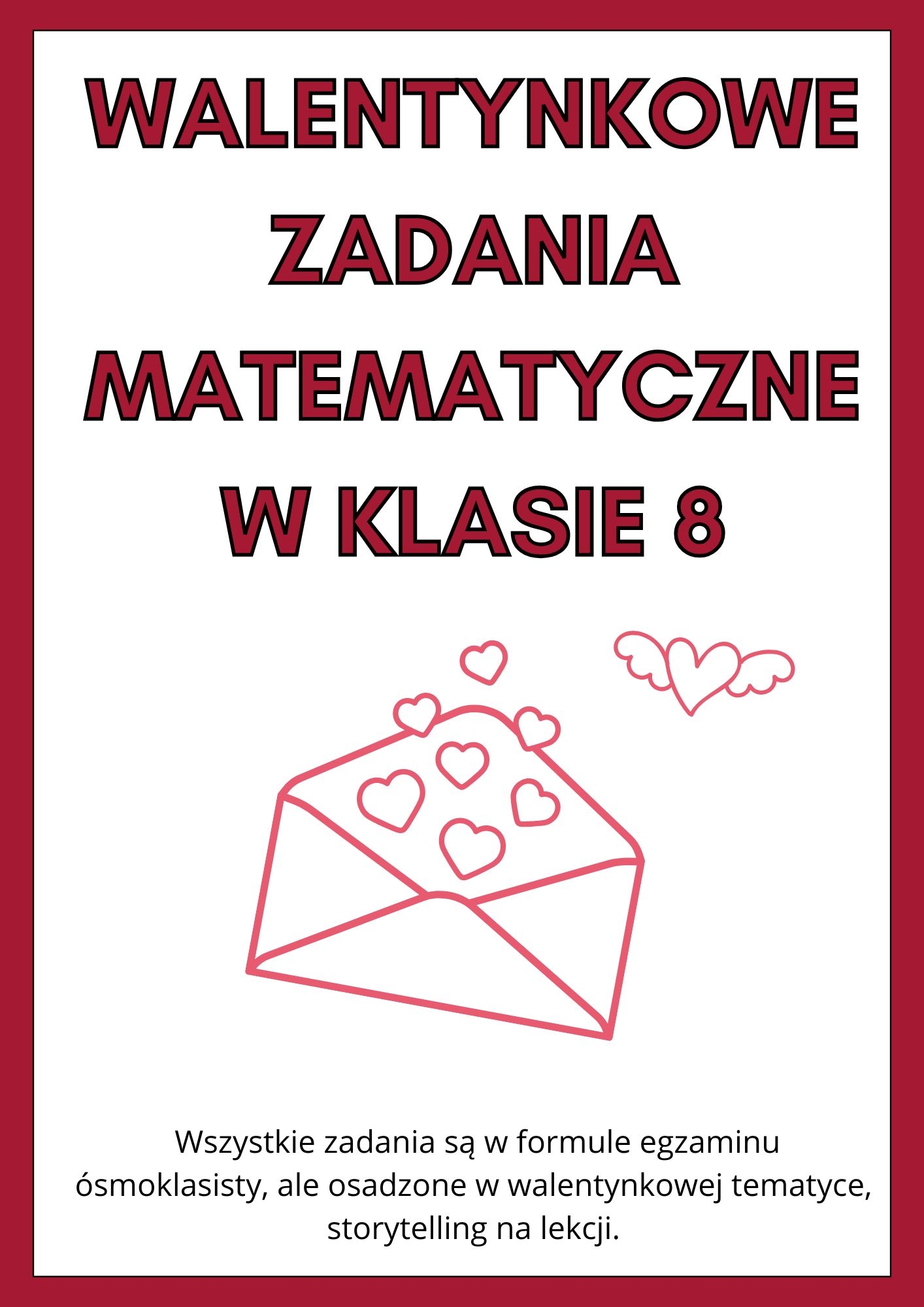Przygotowano pięć zadań matematycznych na poziomie egzaminu ósmoklasisty, ujętych w formę walentynkowej opowieści, storytelling na lekcji, który można wykorzystać przed szkolną imprezą.