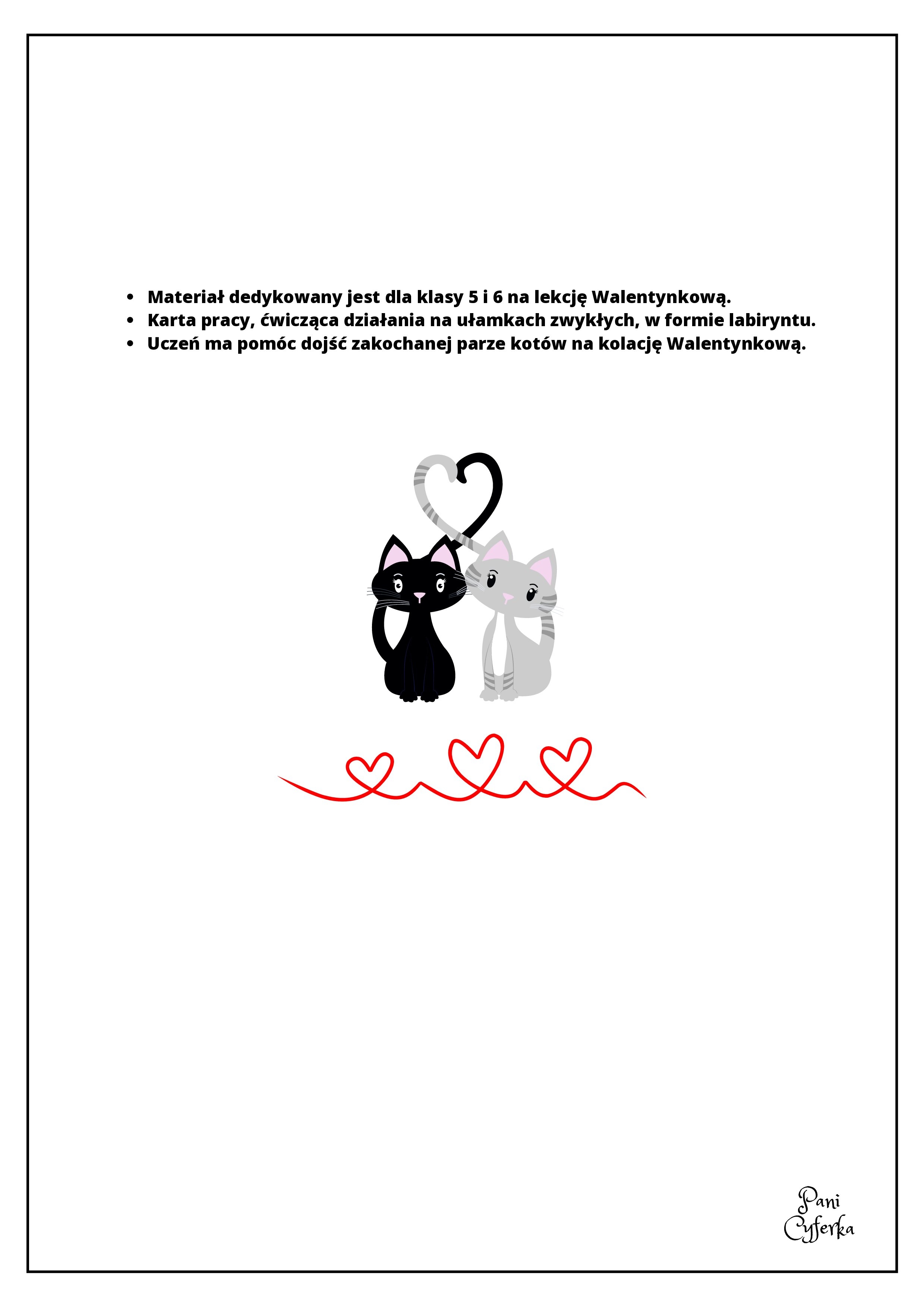 Karta pracy, ćwicząca działania na ułamkach zwykłych, w formie labiryntu. Uczeń ma pomóc dojść zakochanej parze kotów na kolację Walentynkową.
