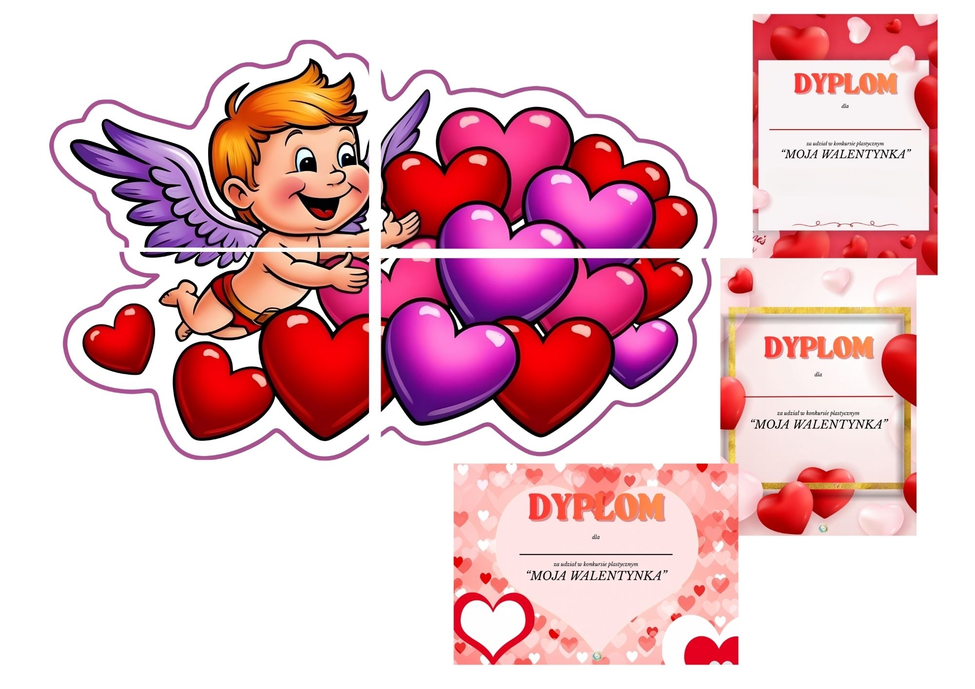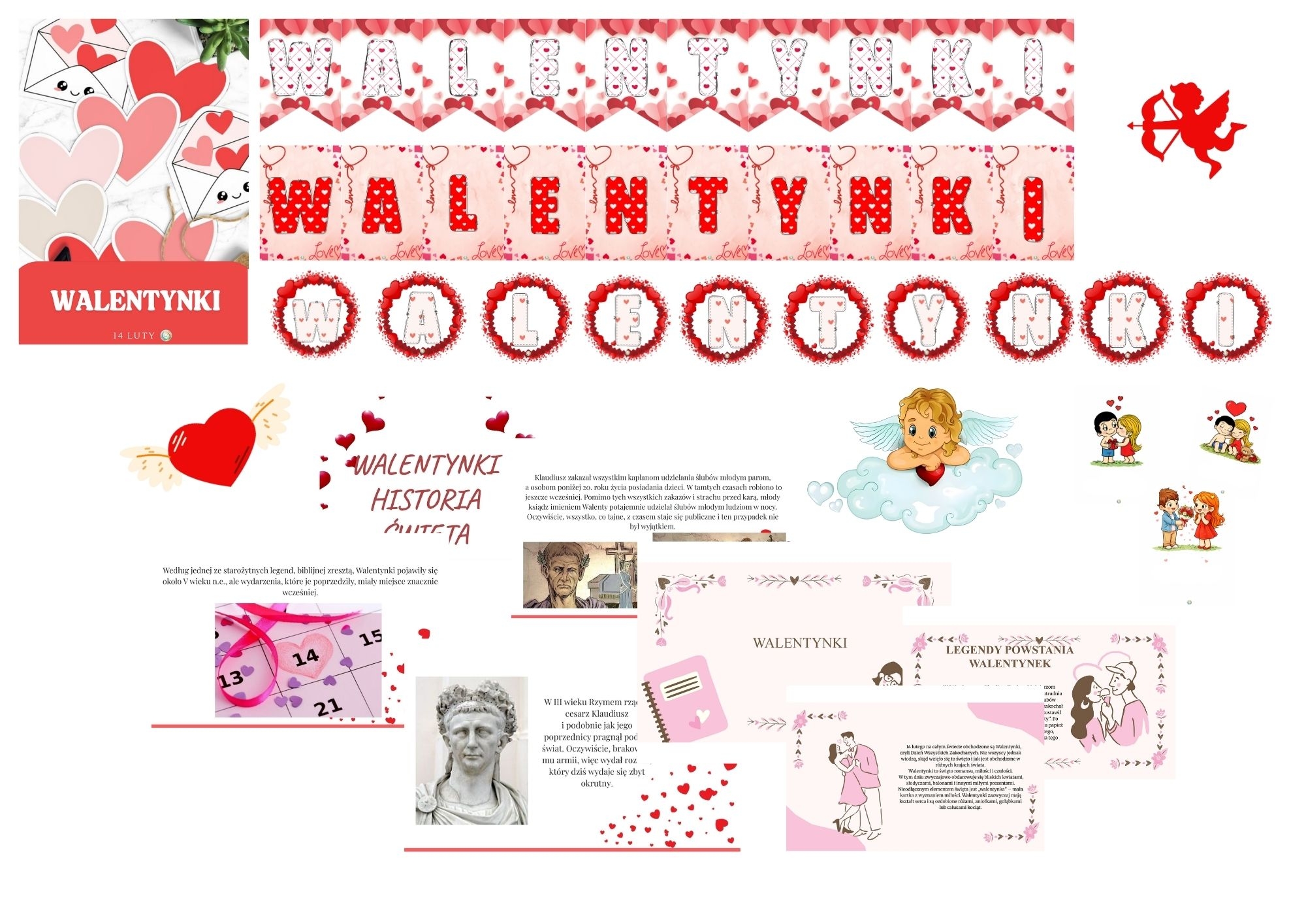 • Dekoracje: serduszka, kupidyn, elementy ozdobne – do tablicy, gazetki lub kącika tematycznego.