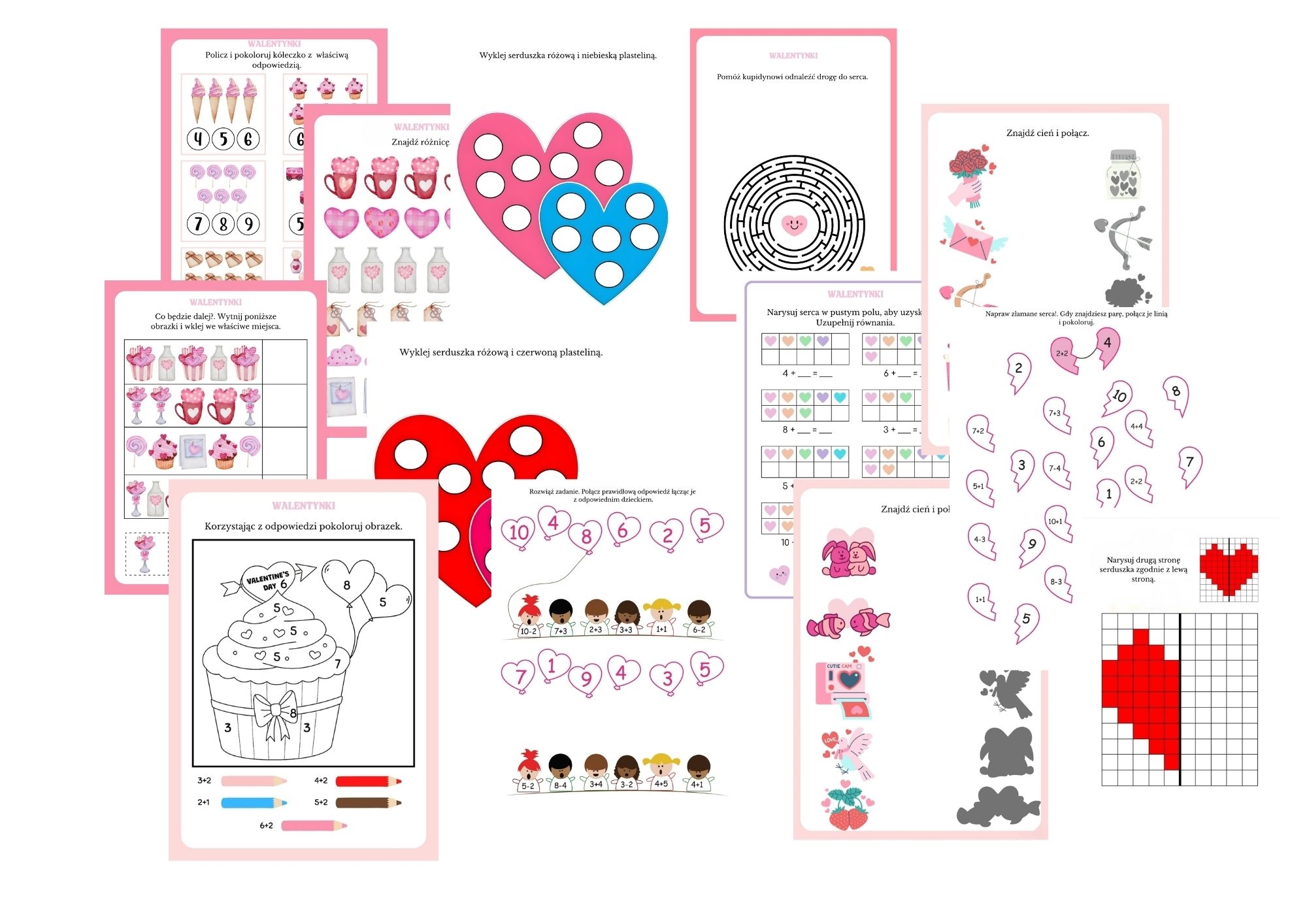 • Walentynkowe karty pracy – różnorodne zadania rozwijające spostrzegawczość, motorykę i logiczne myślenie.