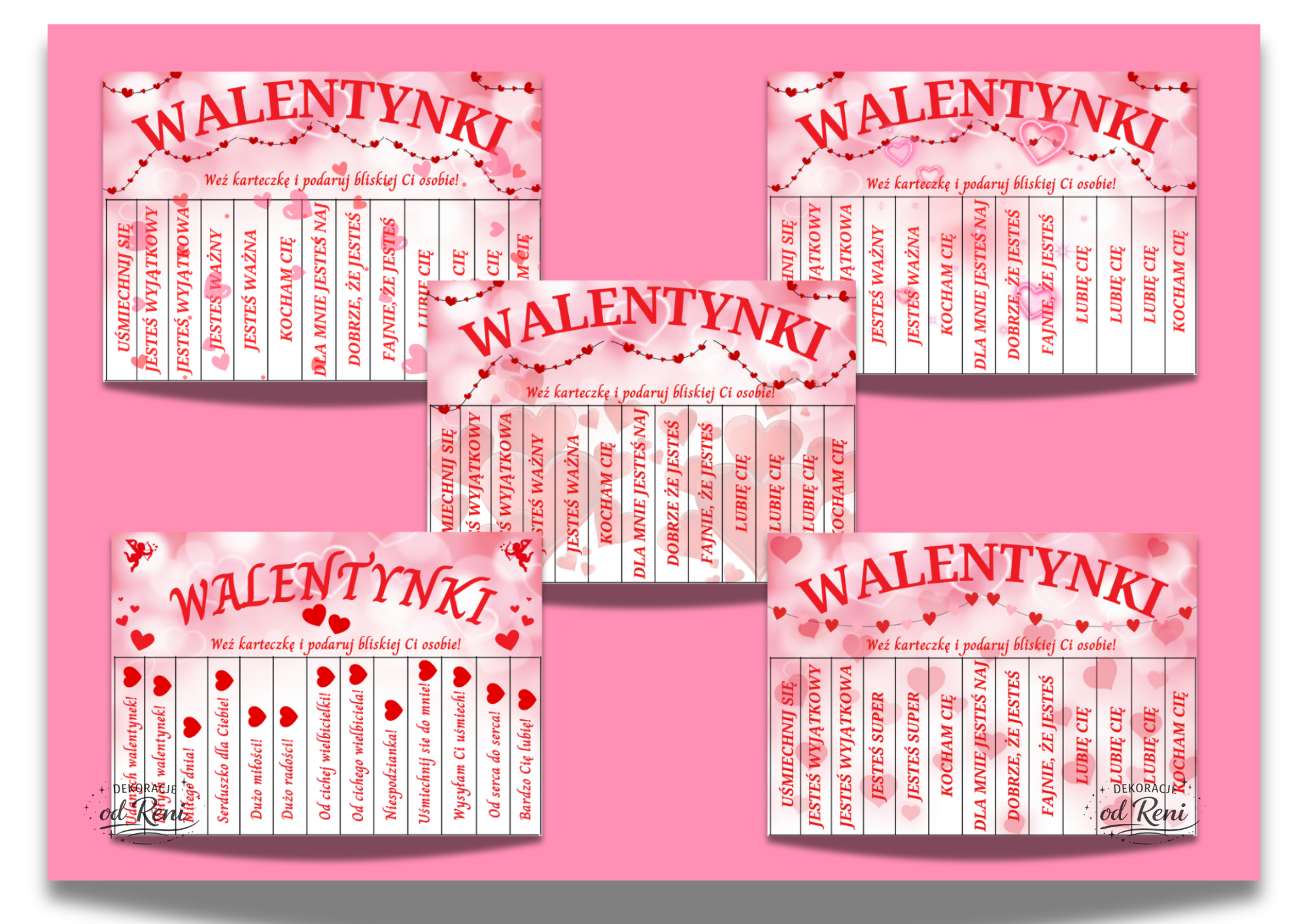 Walentynkowy zestaw miłych słów w formie pliku PDF, stworzony z myślą o budowaniu życzliwej i serdecznej atmosfery. Materiał obejmuje 5 kartek w formacie A4, z których każda zawiera 13 krótkich, miłych haseł do oderwania i podarowania innej osobie. Doskonale sprawdzi się jako element walentynkowej dekoracji oraz szkolnych i przedszkolnych akcji związanych z Dniem Świętego Walentego. Produkt przeznaczony do samodzielnego wydruku i natychmiastowego wykorzystania.