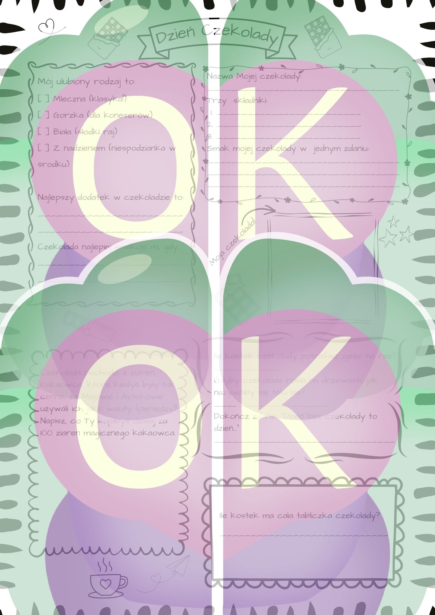 Gazeta „Wiadomości Czekoladowe”: Specjalna karta do uzupełnienia stylizowana na pierwszą stronę gazety. Idealne miejsce na gorące newsy ze świata słodkości!