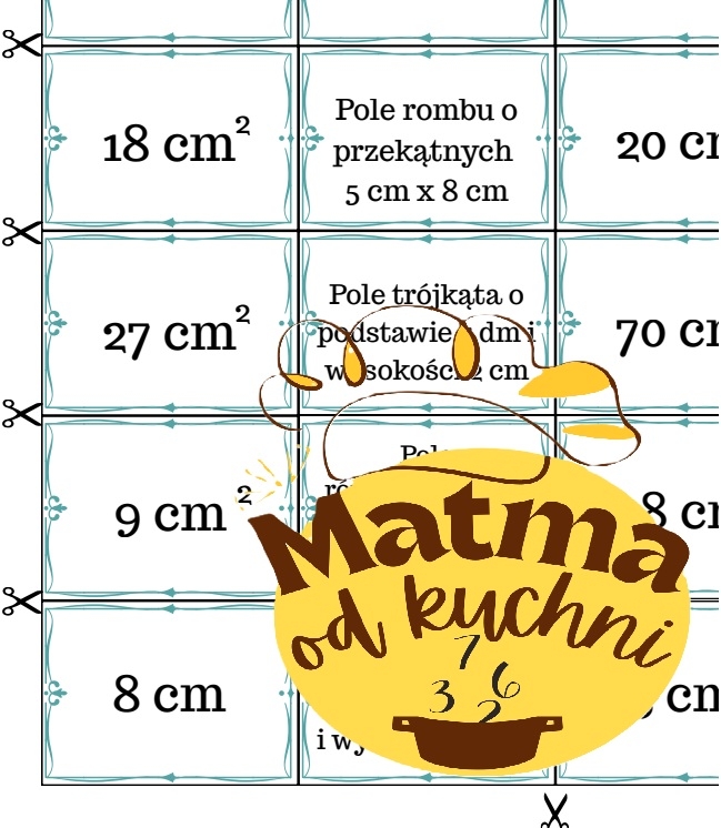 Materiał składa się z dwóch zestawów po 10 kafelków, zawierających zadania dotyczące obliczania pól czworokątów i trójkątów. W pierwszym długości boków są liczbami naturalnymi, w drugim dłuości boków są ułamkami dziesiętnymi.