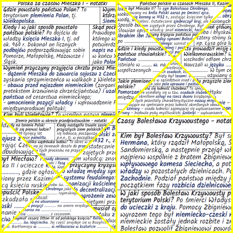 Zestaw notatek w formie pytań i odpowiedzi do zagadnień związanych z początkami państwowości polskiej i panowaniem pierwszych władców z dynastii Piastów (od Mieszka I do Bolesława Krzywoustego) przygotowany dla klasy 5 według podstawy programowej nauczania historii w szkole podstawowej (Podstawa programowa – Historia – Szkoła podstawowa IV-VIII) oraz komplet kart pracy zawierających luki w treści wymagające uzupełnienia ustnego lub pisemnego.