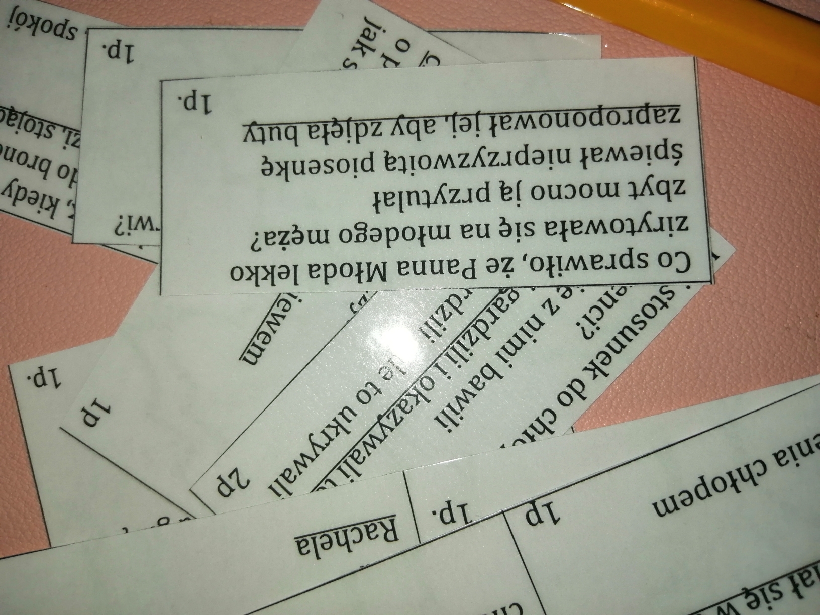 Gra dydaktyczna w postaci niewielkich kart - 3o na stronie A-4 . Każda karta zawiera pytanie i odpowiedź lub ( zwykle) opcje odpowiedzi z wyraźnie zaznaczoną poprawną. Moi uczniowie wzajemnie zadają sobie pytania i świetne się przy tym bawią. Można też grać w klasyczną grę planszową i iść do przodu po udzieleniu poprawnej odpowiedzi ... Możliwości jest wiele.