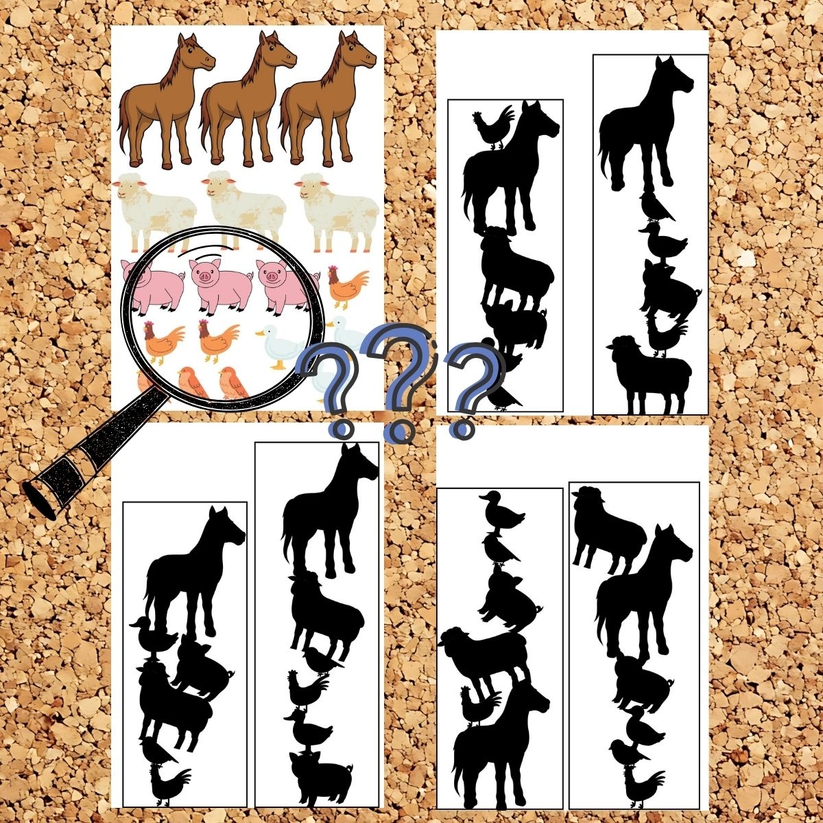 • karty ze wzorami przedstawiającymi cienie zwierząt nakładających się na siebie