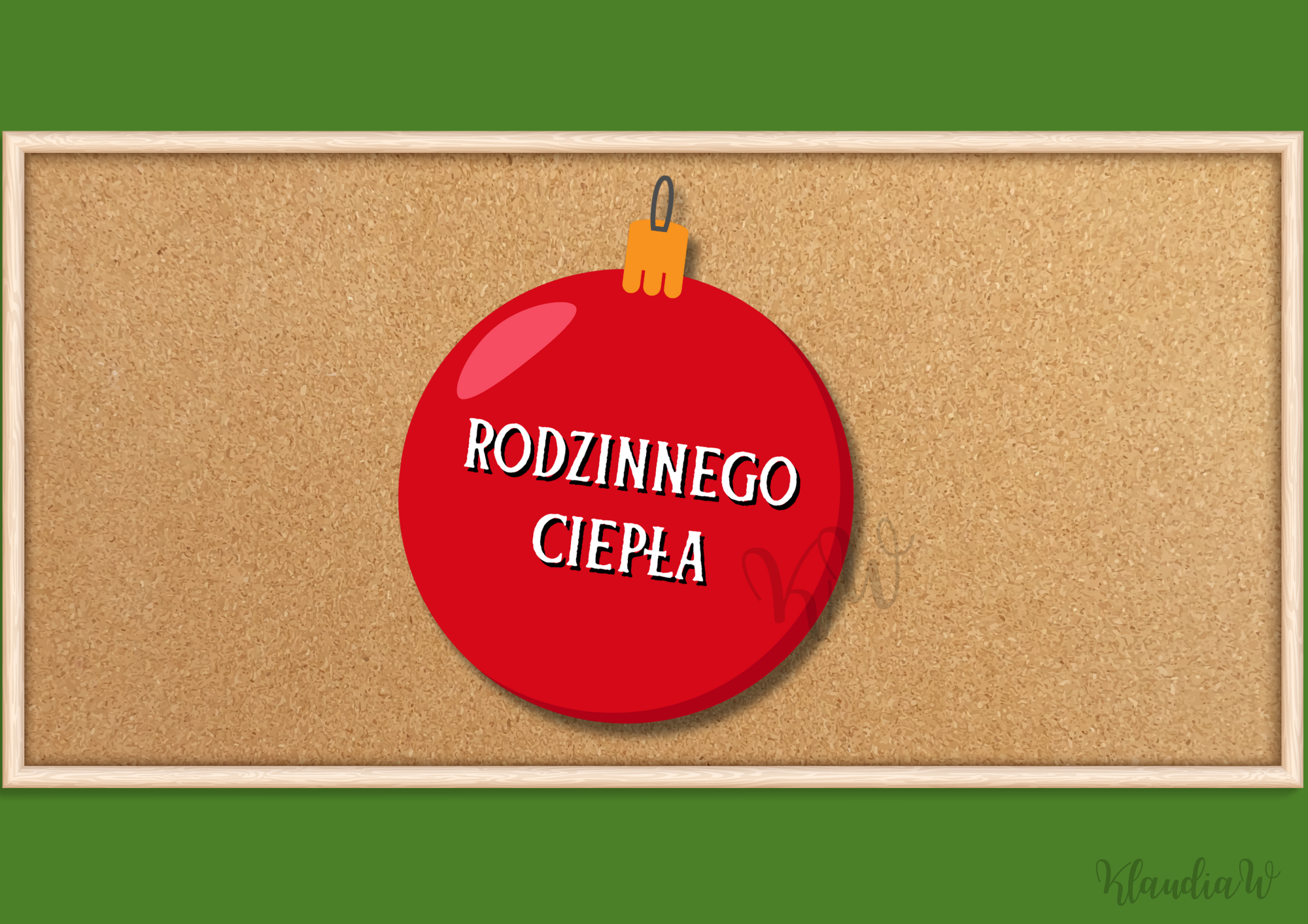 9 czerwonych bombek formatu A4 z gotowymi życzeniami – łatwe do wycięcia i powieszenia, tworzą świąteczny klimat.