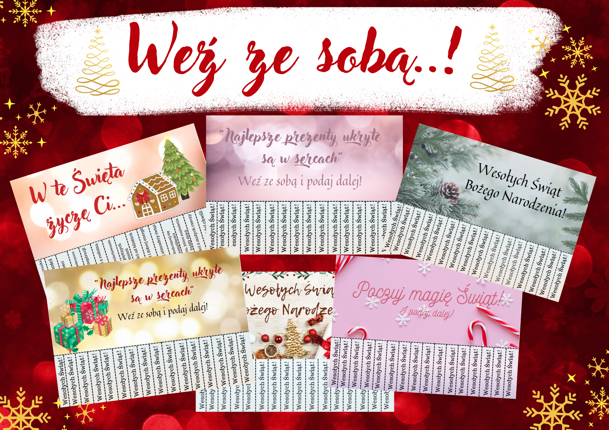 Akcja „Weź ze sobą...!– edycja świąteczna” to inicjatywa, która ma na celu szerzenie ciepła, radości i życzliwości w wyjątkowym czasie Świąt Bożego Narodzenia. W ramach akcji zostało przygotowanych 16 kolorowych kart A4 z odrywankami do samodzielnego wydruku! Karty są pełne inspirujących, świątecznych pozdrowień, życzeń i krótkich przesłań, które każdy może zabrać ze sobą.