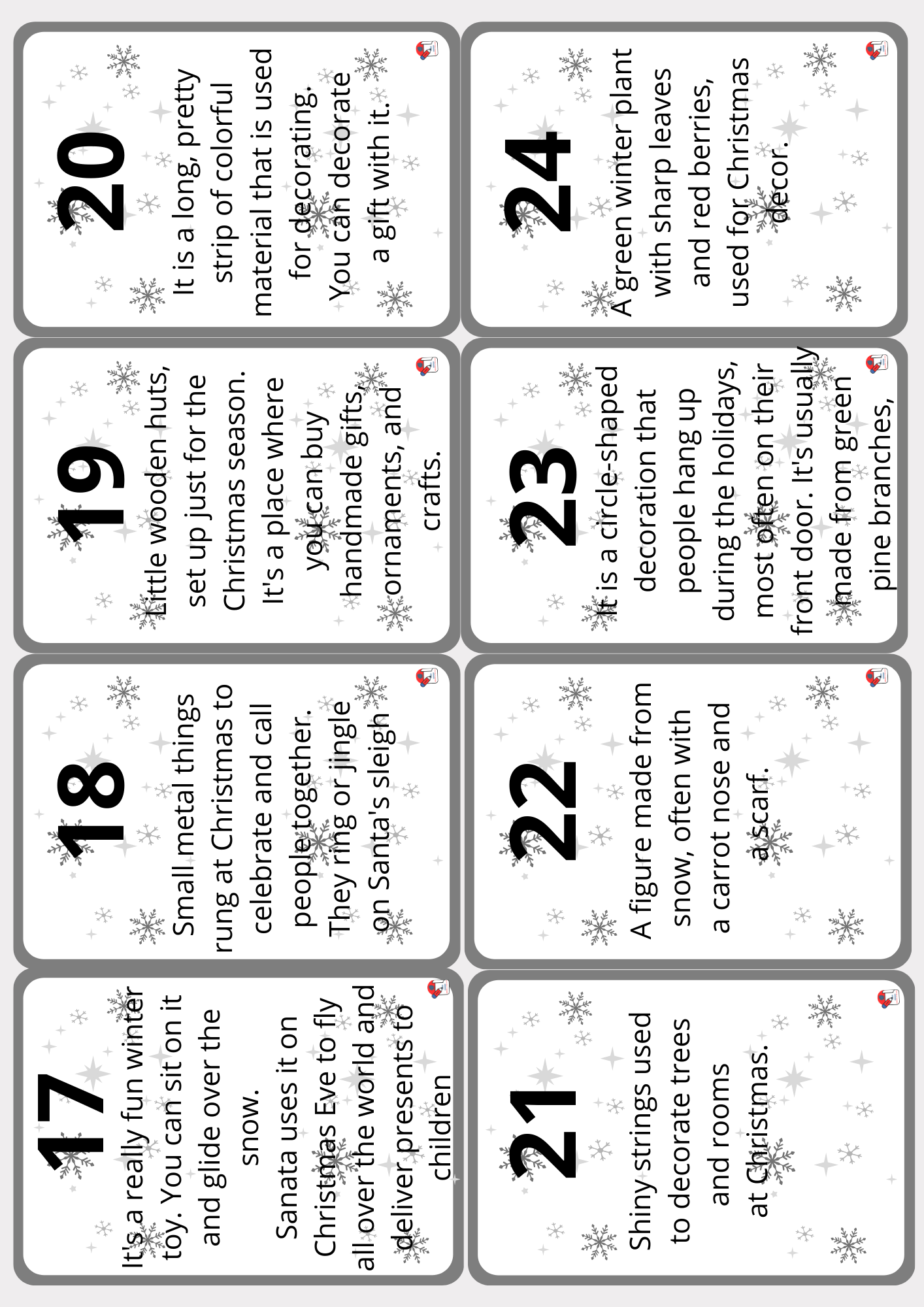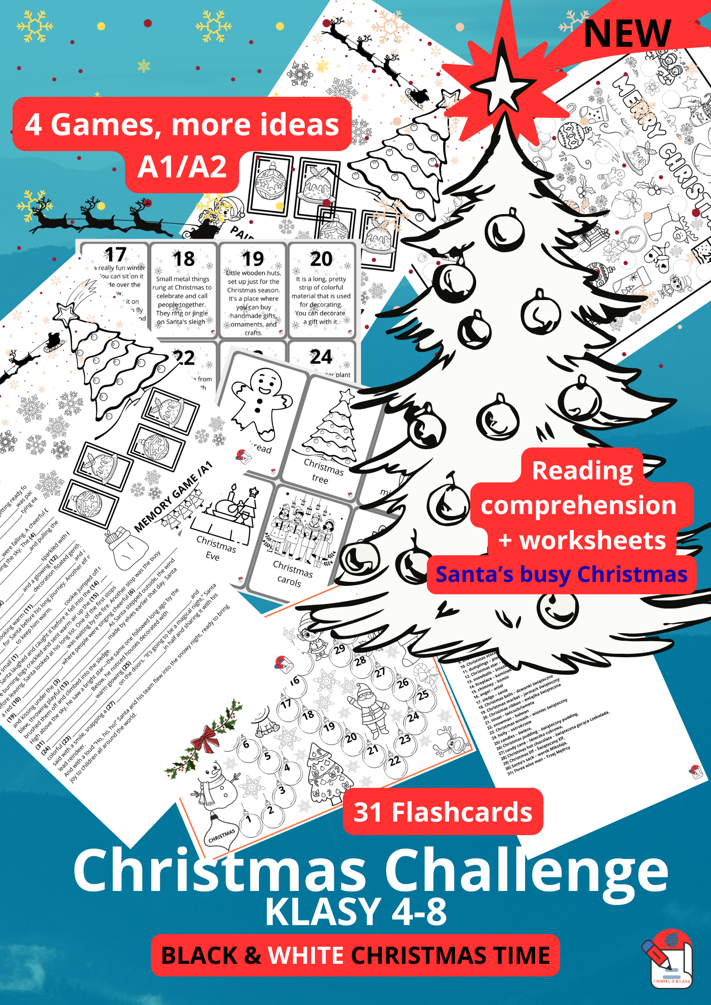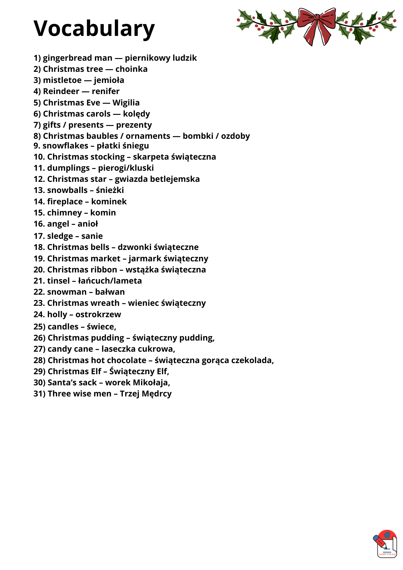 - 31 ŚWIĄTECZNYCH HASEŁ : Zestaw obejmuje 31 kluczowych słów związanych z Bożym Narodzeniem (od sledge i reindeer po Christmas pudding i Three wise men). Idealne do poszerzania słownictwa i wiedzy o kulturze!