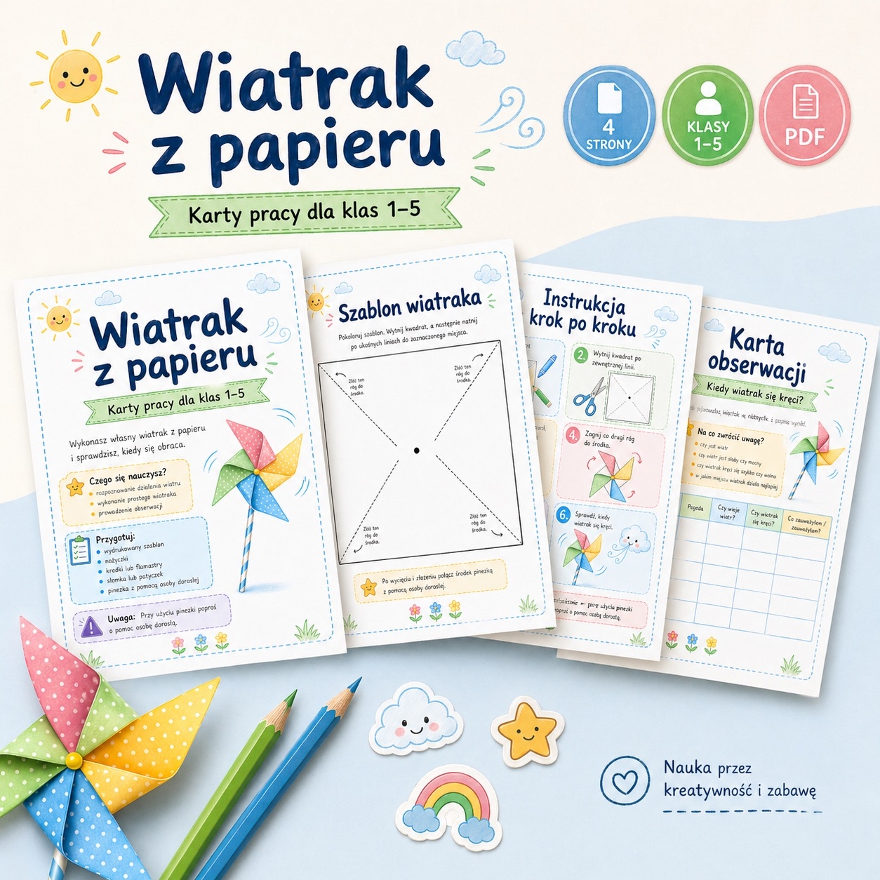 Materiał rozwija sprawność manualną, uczy uważnej obserwacji, wspiera samodzielność i pomaga dzieciom zrozumieć, że wiatr może wprawiać przedmioty w ruch. Prosty, kolorowy i praktyczny zestaw do wydruku sprawdzi się zarówno w klasie, jak i podczas zajęć świetlicowych. 📝✨