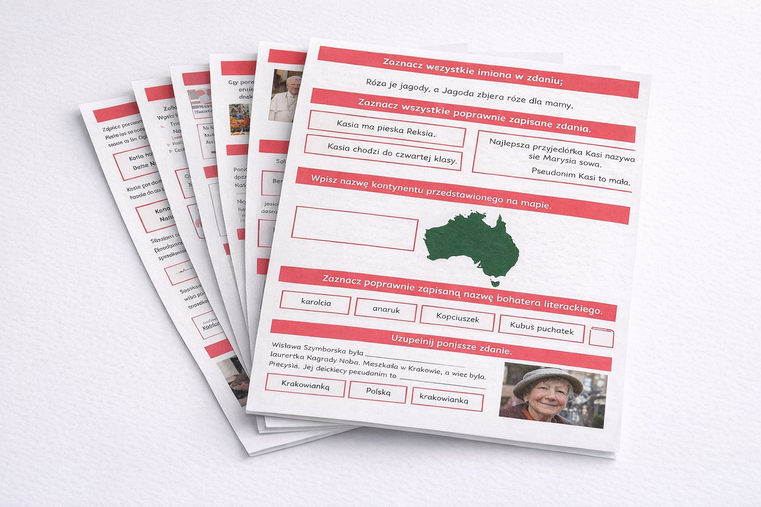 🔹 Różnorodne typy zadań – zaznaczanie, uzupełnianie, wybór poprawnej odpowiedzi, przepisanie tekstu