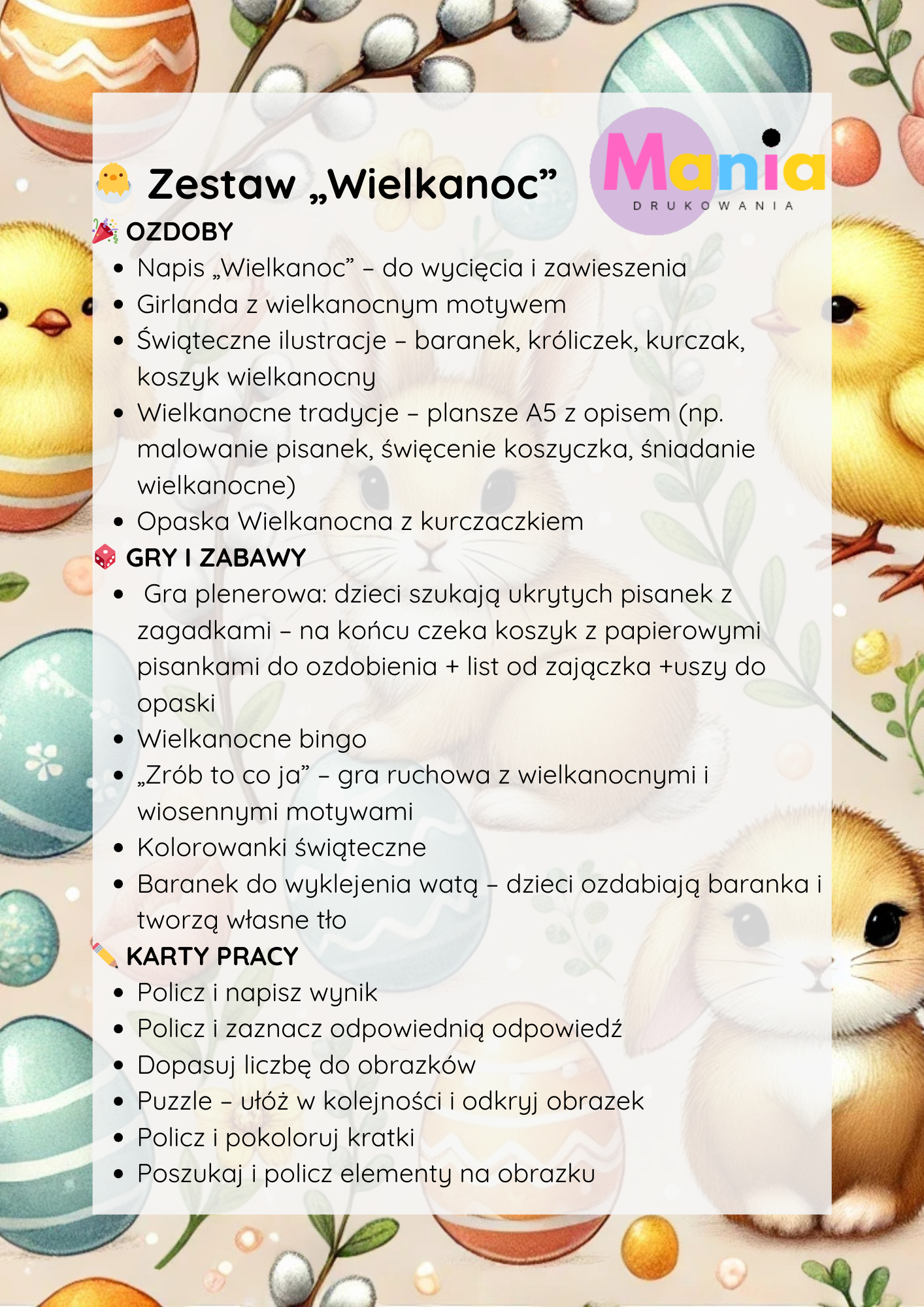 Mania Drukowania – kreatywne materiały edukacyjne do drukuW sklepie Mania Drukowania oferujemy starannie opracowane materiały PDF do samodzielnego wydruku, stworzone z myślą o nauczycielach, terapeutach, rodzicach oraz wszystkich, którzy pracują z dziećmi w wieku przedszkolnym i wczesnoszkolnym.Nasza oferta obejmuje m.in.: karty pracy i zadania rozwijające umiejętności dzieci, gry edukacyjne, zabawy ruchowe i pakiety tematyczne, dekoracje na święta, uroczystości przedszkolne i pory roku, zaproszenia i ozdoby na urodziny oraz inne okazje, kalendarze, girlandy, plakaty oraz dodatki do organizacji zajęć. Dlaczego warto wybrać Mania Drukowania?✔️ Materiały tworzone z dbałością o estetykę i wartość edukacyjną.✔️ Pomoc w organizacji zajęć, świąt i codziennej pracy z dziećmi.✔️ Jasne instrukcje, kolorowe grafiki i przyjazny styl pracy z dziećmi. Naszą misją jest wspieranie edukacji przez kreatywne i atrakcyjne rozwiązania gotowe do użycia – zawsze w duchu nauki przez zabawę.