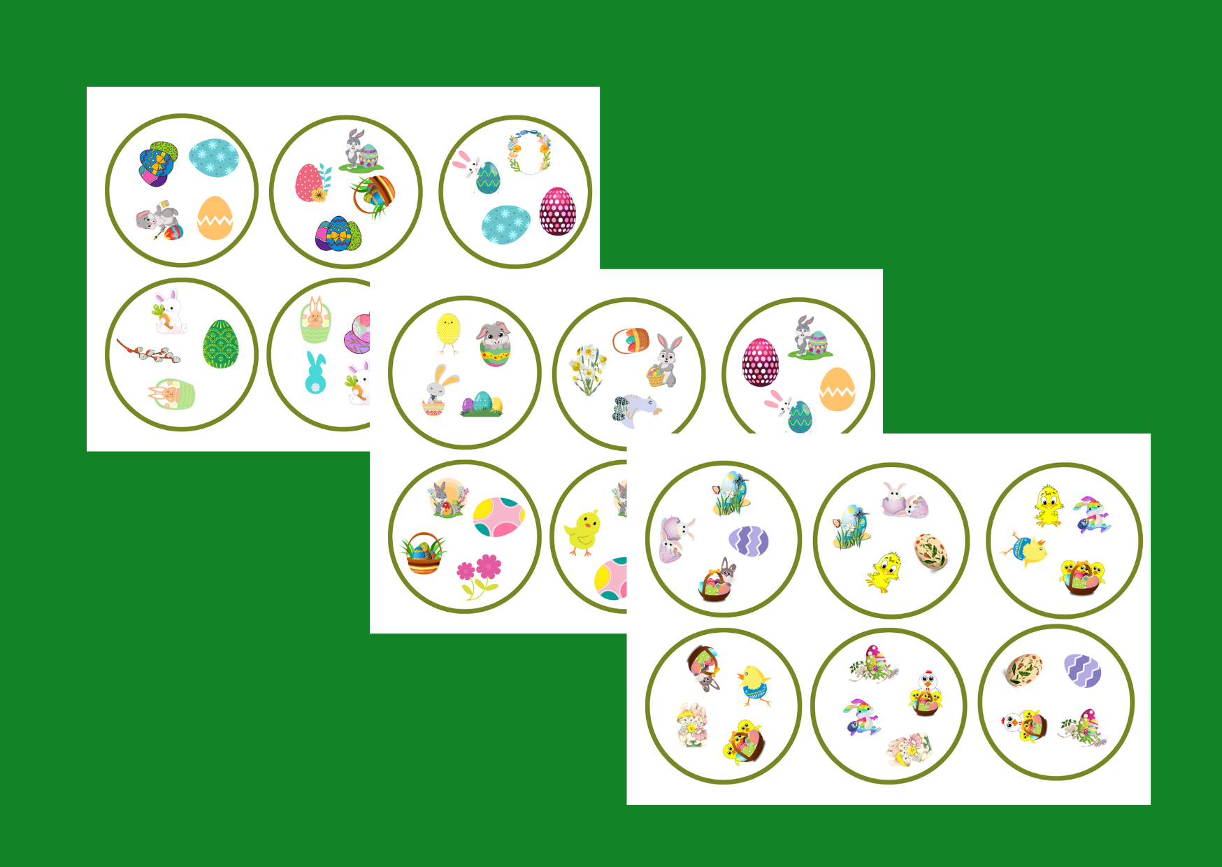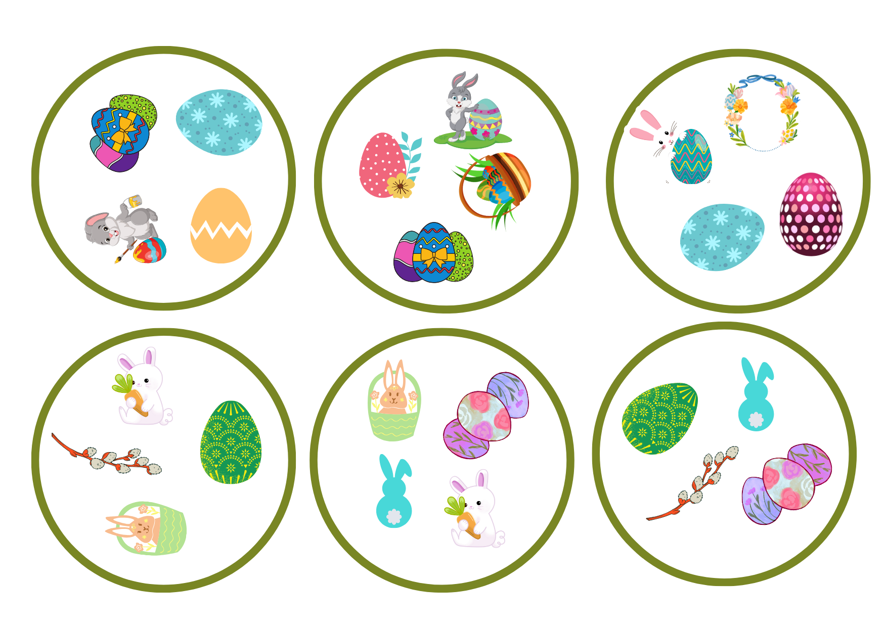 Zestaw zawiera 6 kart w wersji kolorowej. Na każdej karcie znajduje się 6 kół z obrazkami kojarzącymi się z Wielkanocą. Po wycięciu materiał można zalaminować, aby dłużej służył. Można je wykorzystać na lekcji do ćwiczeń redakcyjnych, gramatycznych czy ortograficznych.