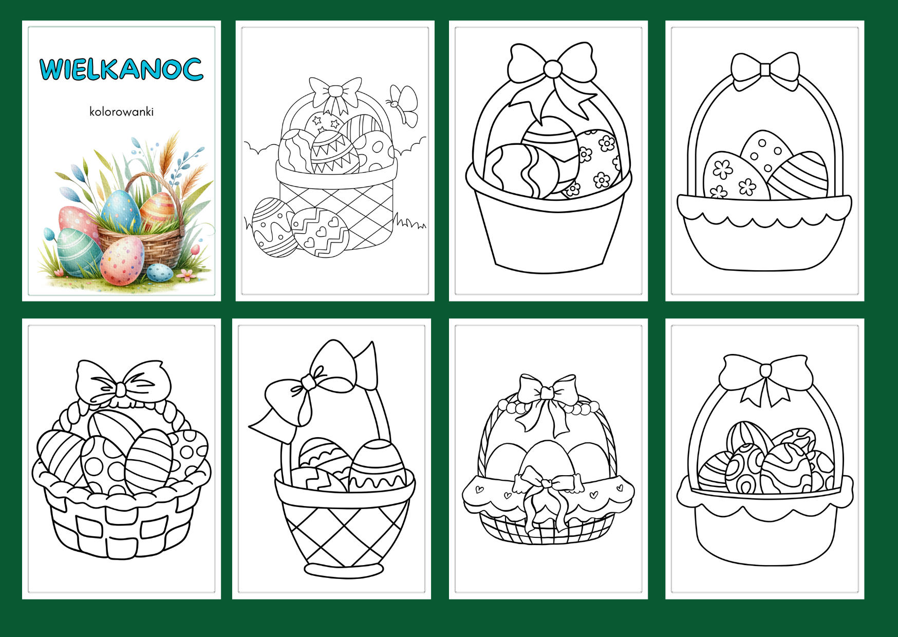 Materiał zawiera 30 kolorowanek z koszyczkami wielkanocnymi oraz stronę tytułową. Po pomalowaniu przez dzieci kolorowanek, można stworzyć gazetkę – klasową galerię koszyczków. Wszystkie karty mają format A4.