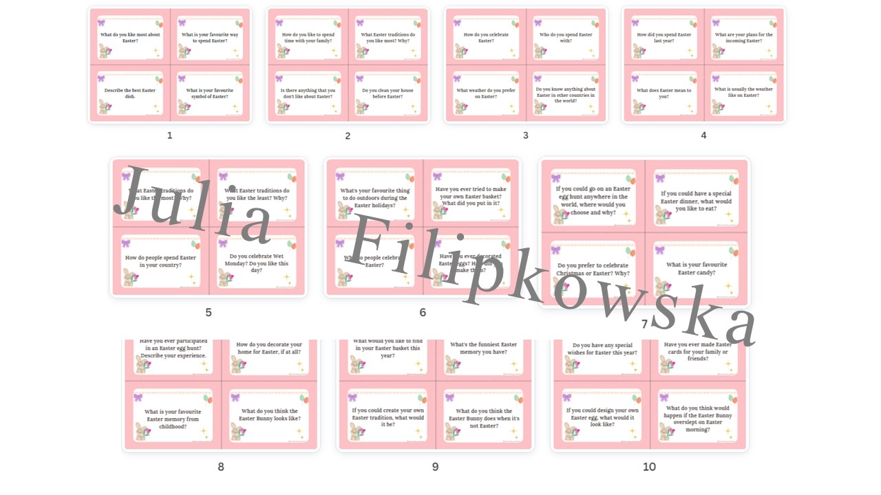 Zapraszam do zakupu materiału w języku angielskim: 10 stron A4, a w nich aż 40 pytań do speaking’u. Polecam karty wyciąć i zalaminować dzięki czemu wystarczą na wiele lat. Pytania są przeznaczone dla każdego ucznia. Dzięki tej różnorodności można wykorzystać je od 4. klasy aż do liceum, a nawet i dla dorosłych