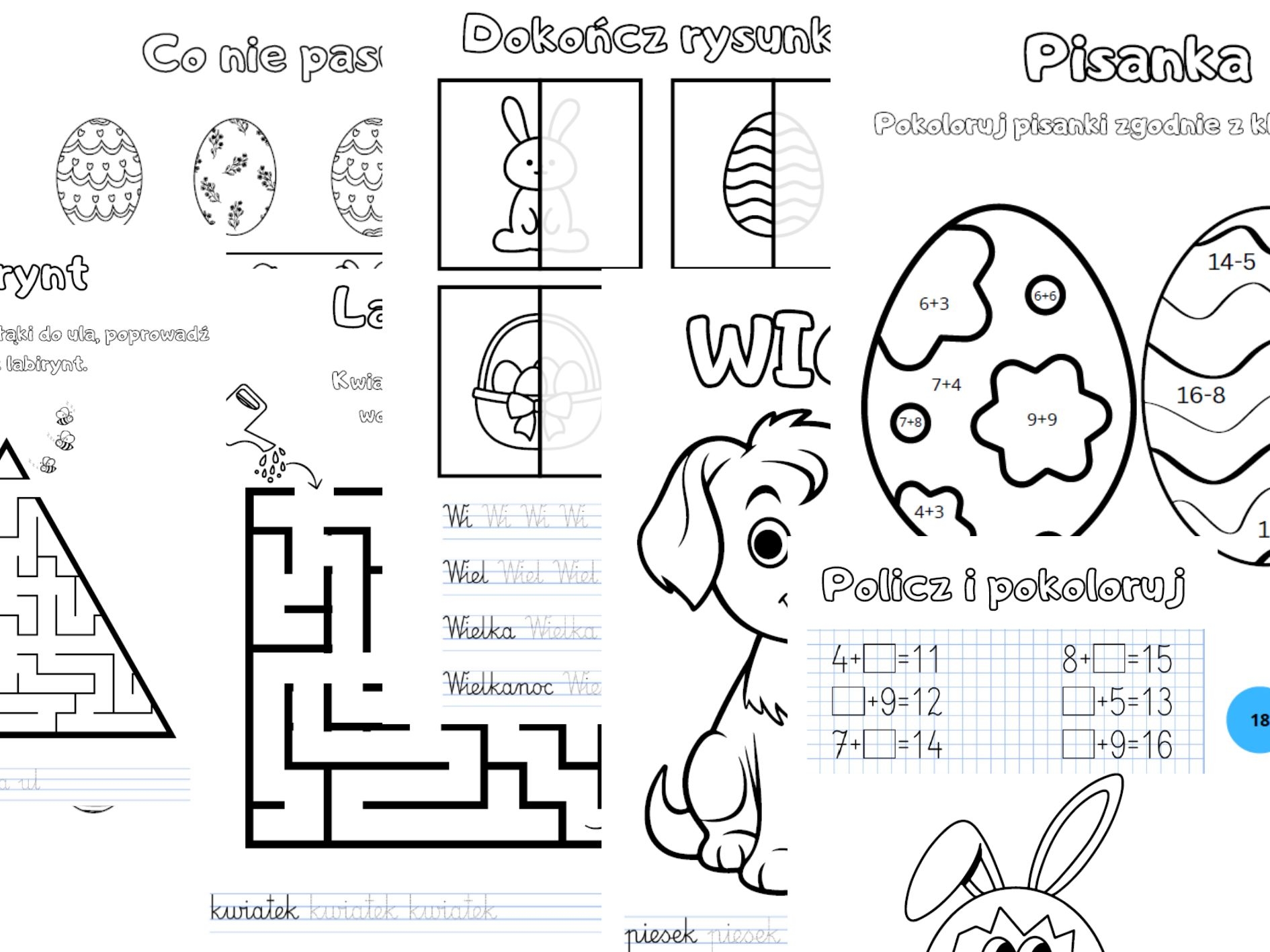 Pisanie po śladzie, znajdź niepasujący element, policz i zaznacz wynik, pokoloruj, labirynty.