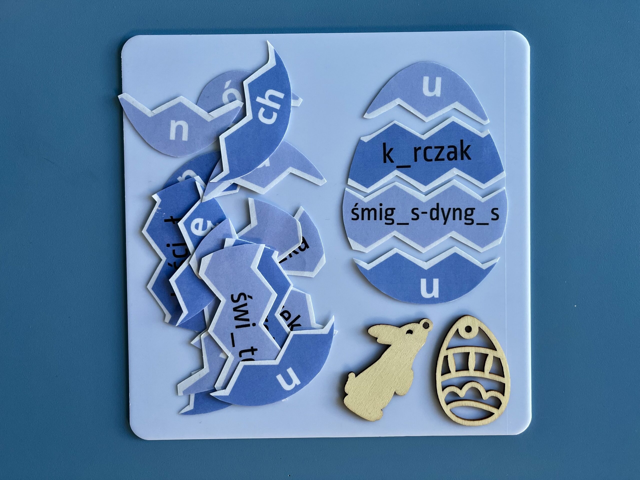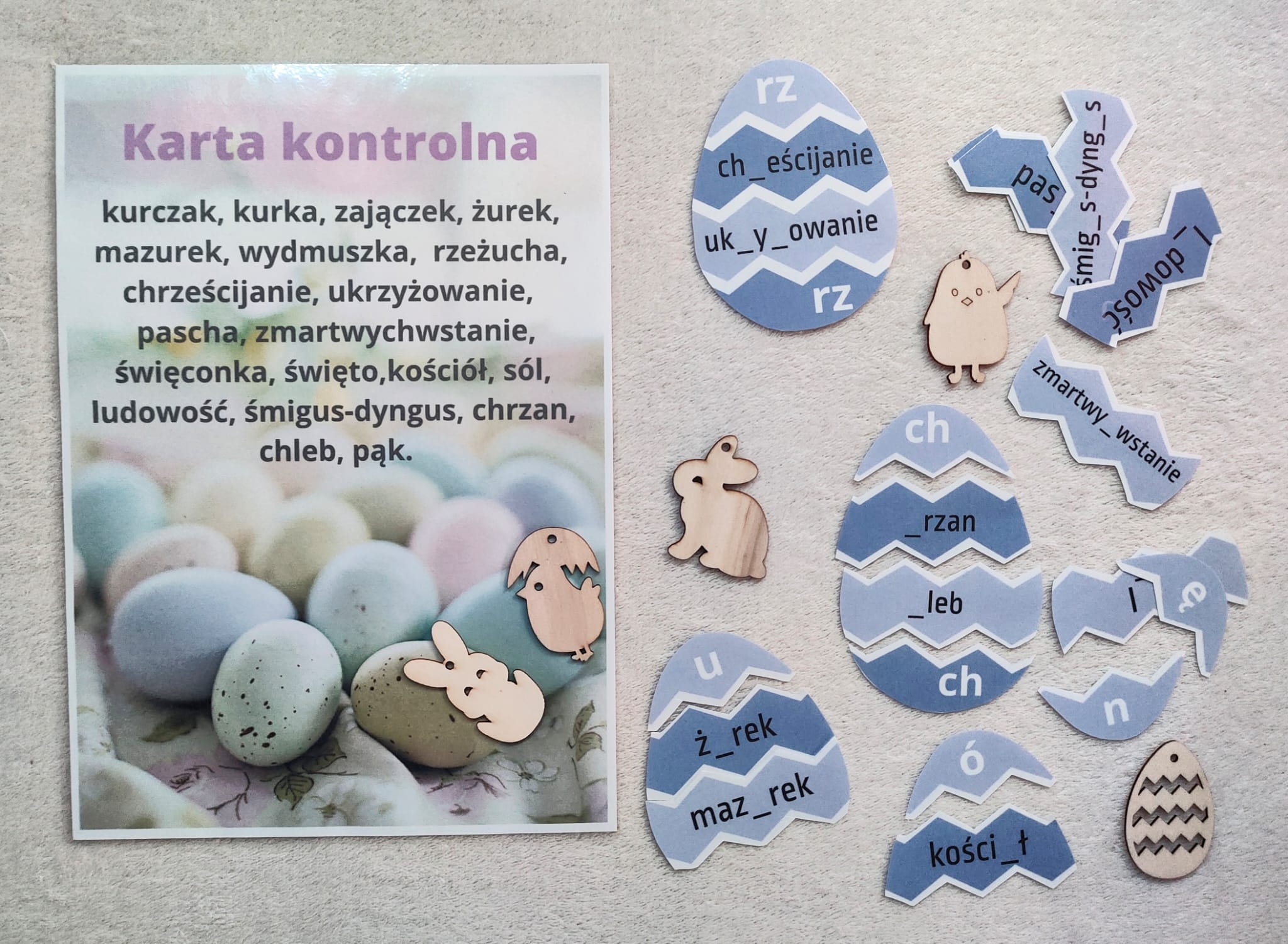 Jajeczka drukujemy, laminujemy i wycinany po zygzaku - zadaniem ucznia jest ułożyć, właściwie dopasować wyrazy - niczym puzzle.