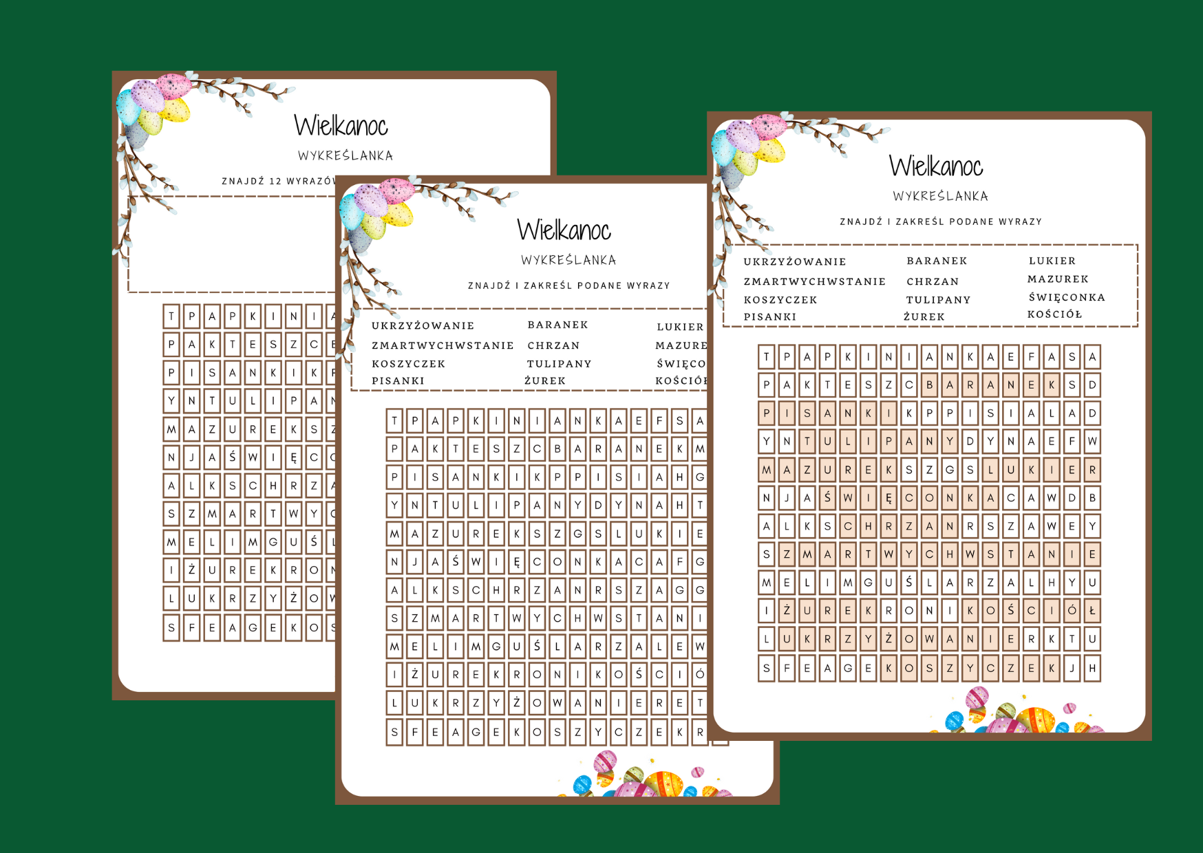 Materiał zawiera wykreślankę dotyczącą Wielkanocy (3 wersje: z odpowiedziami, bez odpowiedzi, bez wyrazów do odnalezienia). Po odnalezieniu wyrazów można wykorzystać je np. do ćwiczeń redakcyjnych czy ortograficznych.