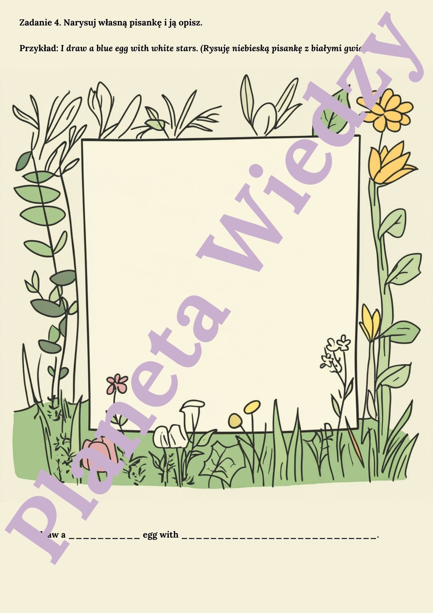 Dzieci rysują własną pisankę i opisują ją po angielsku.