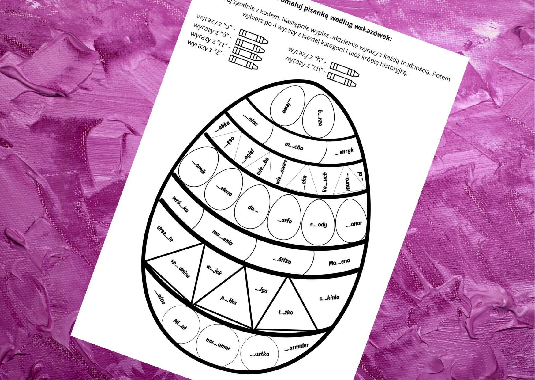 Kolorowanka w kształcie pisanki. Zadaniem uczniów jest pokolorowanie pisanki według wskazówek. Materiał dotyczy wyrazów z "ó", "u", "rz", "ż", "ch" i "h". Po pokolorowaniu wyrazy można wykorzystać do ćwiczeń ortograficznych i redakcyjnych. Młodsi uczniowie mogą pracować ze słownikiem ortograficznym.