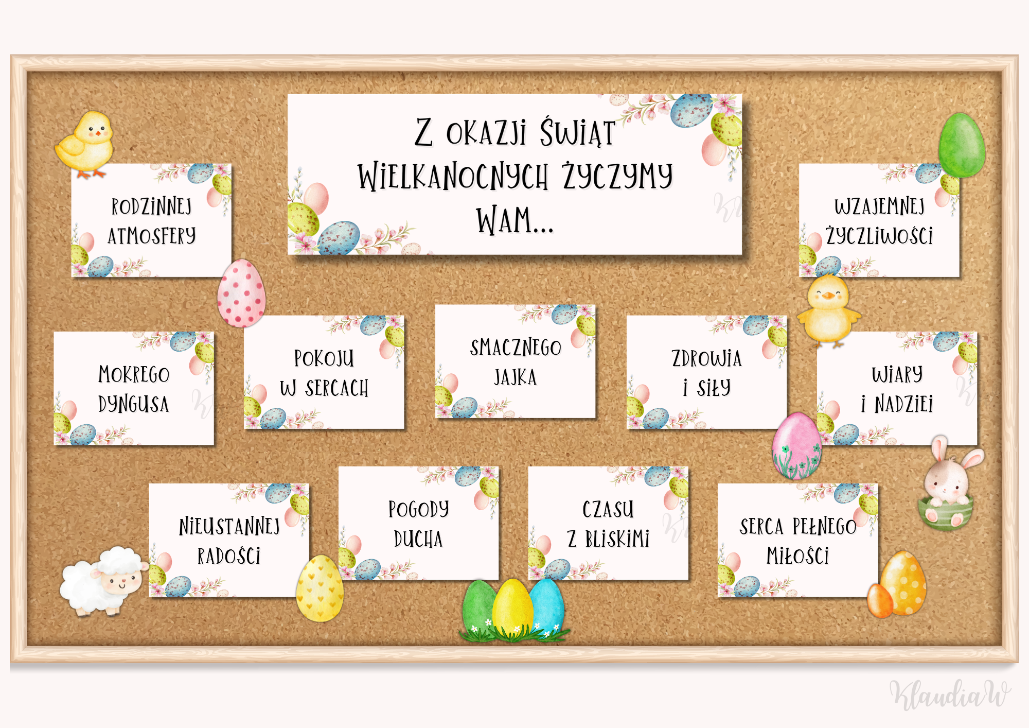 • planszę tytułową „Z OKAZJI ŚWIĄT WIELKANOCNYCH ŻYCZYMY WAM...” w dwóch wariantach - do złożenia z 4 lub 2 stron A4,