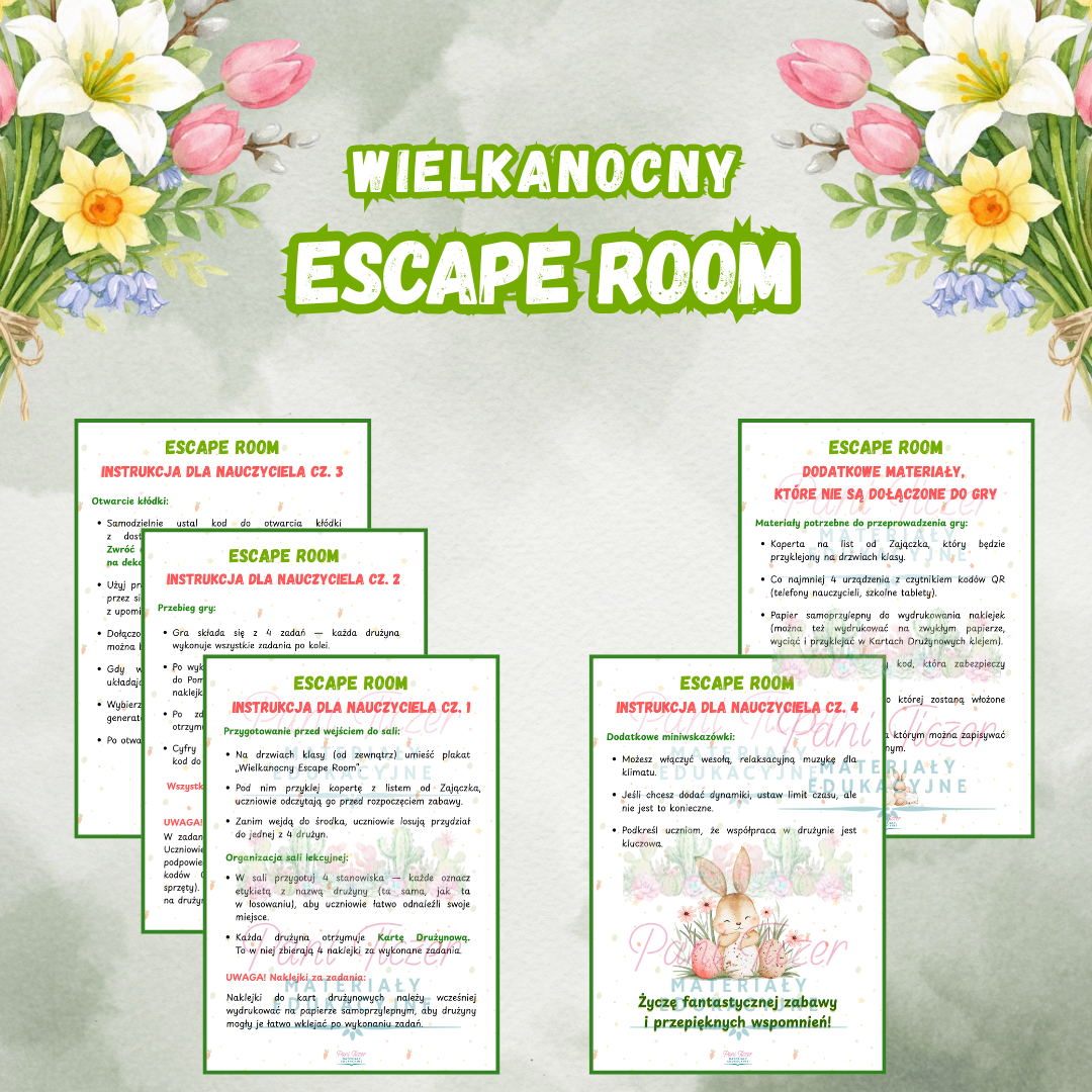 Zorganizuj angażującą lekcję z motywem wielkanocnym. Ten Escape Room to gotowy scenariusz zabawy edukacyjnej, która uczy współpracy, logicznego myślenia i spostrzegawczości. Materiały są estetyczne, czytelne i przygotowane do natychmiastowego wykorzystania w klasie.