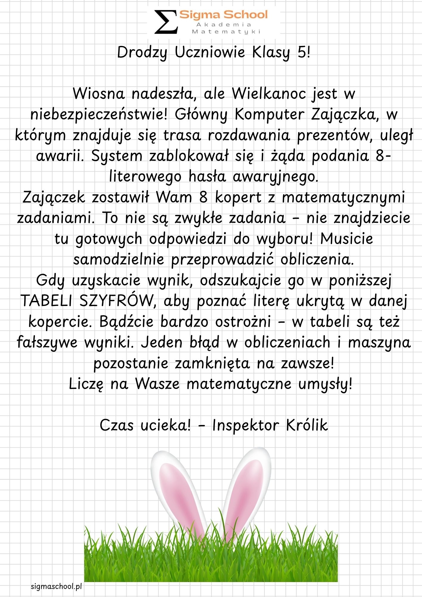 O co chodzi w grze? Główny Komputer Zajączka uległ awarii, a trasa rozdawania prezentów została zablokowana! Aby uratować Wielkanoc, uczniowie muszą zdobyć awaryjne, 8-literowe hasło. Zrobią to, rozwiązując 8 matematycznych zagadek ukrytych w kopertach na terenie klasy. Wyniki działań muszą odszukać w specjalnej Tabeli Szyfrów, która zamieni liczby na litery. Uwaga: w tabeli są też zmyłki, więc nie ma mowy o zgadywaniu – liczą się tylko poprawne obliczenia!