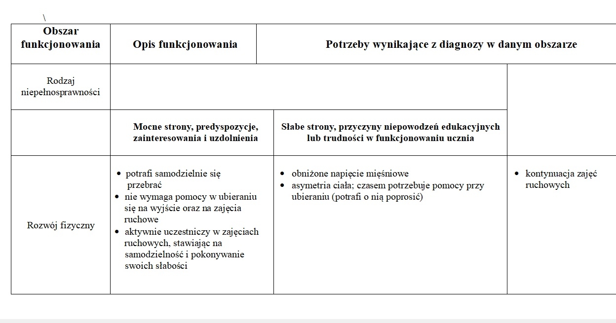 Każdyz obszarów podzielony jest na mocne strony, predyspozycje, zainteresowania i uzdolnienia ucznia oraz słabe strony, przyczyny niepowodzeń edukacyjnych lub trudności w funkcjonowaniu ucznia.