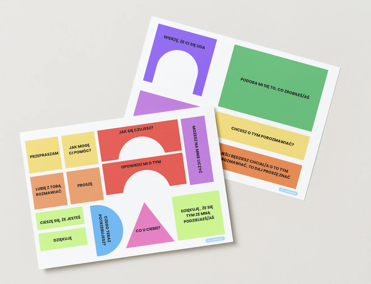 Zawarte w materiale komunikaty, takie jak „Jak się czujesz?”, „Czego teraz potrzebujesz?”, „Możesz na mnie liczyć”czy „Rozumiem, ja mam inne zdanie”, uczą dzieci nazywania emocji, wyrażania potrzeb oraz prowadzenia rozmowy z szacunkiem - nawet w sytuacjach trudnych.