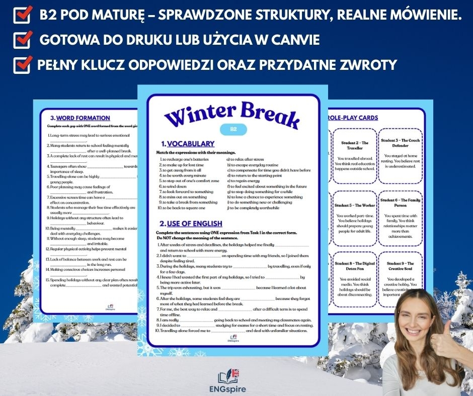 Materiał łączy egzaminacyjną formę z angażującą tematyką ferii zimowych, dzięki czemu świetnie sprawdza się jako powrót do pracy po przerwie, powtórka struktur maturalnych lub lekcja mówienia i argumentowania opinii.