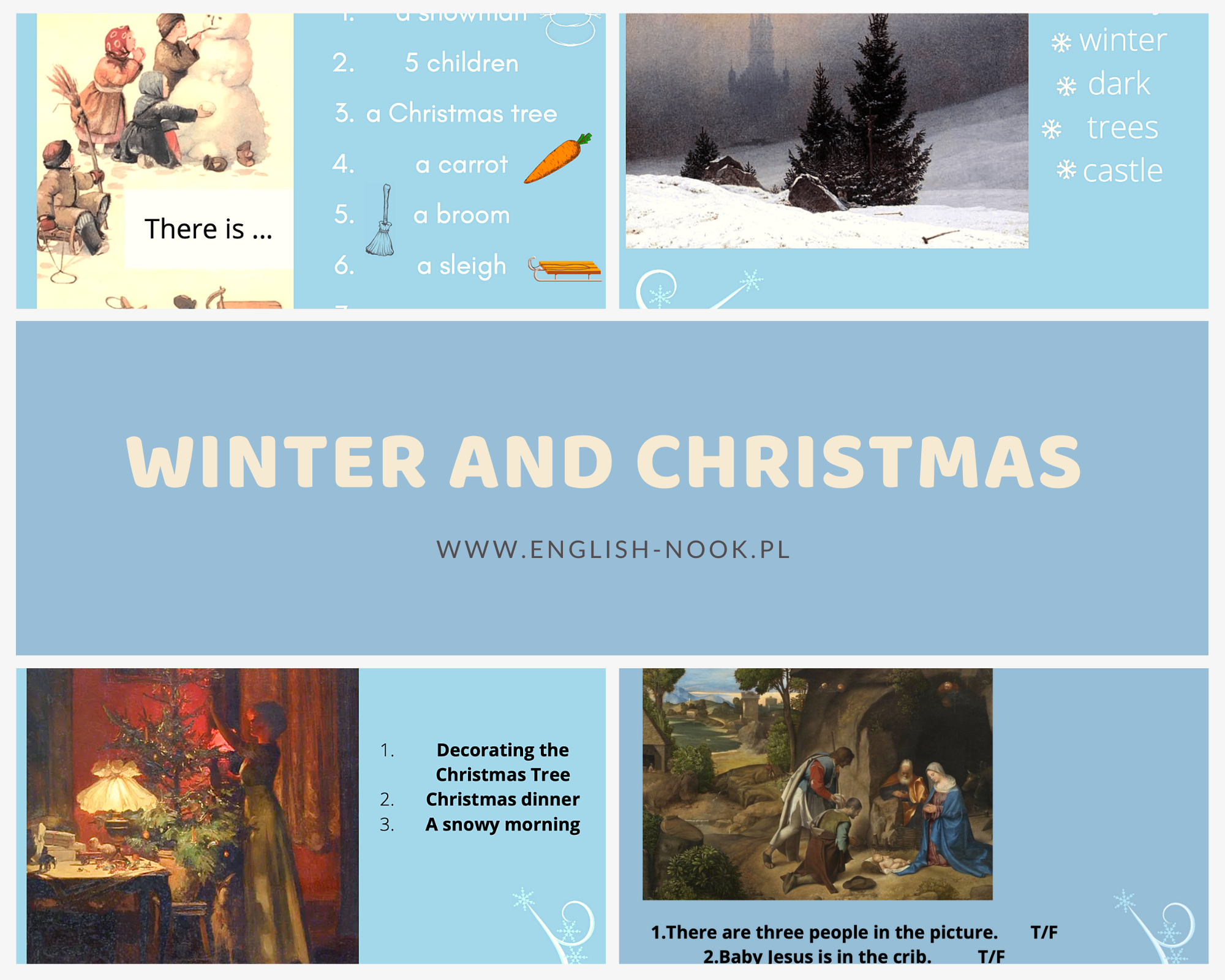 Dzieła sztuki o tematyce świątecznej stanowią tu pretekst do przećwiczenia języka angielskiego w różnych typach zadań (25 slajdów / stron):