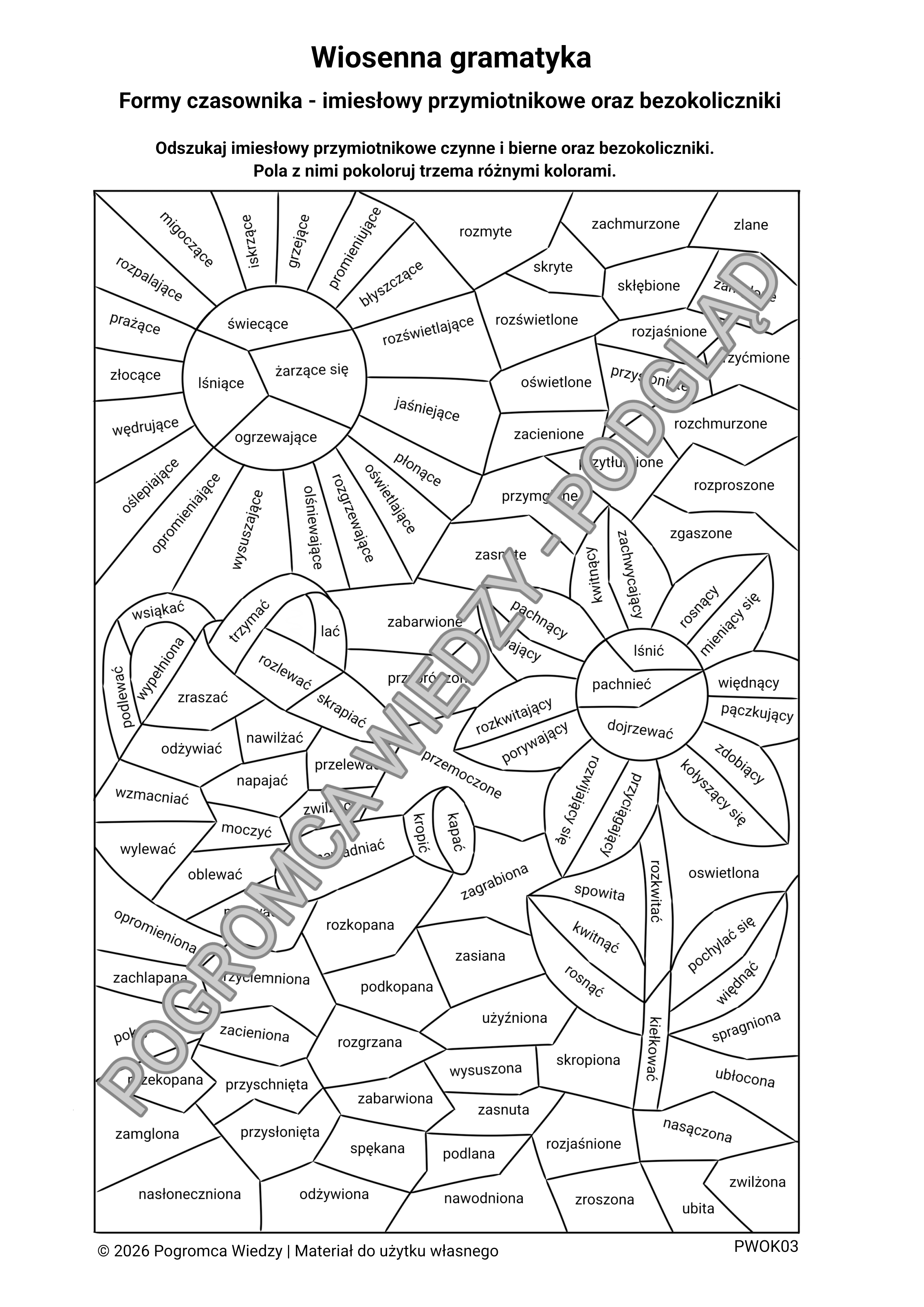 „Wiosenna gramatyka” to karta pracy utrwalająca formy czasownika: imiesłowy przymiotnikowe oraz bezokoliczniki. Uczniowie odnajdują odpowiednie formy wśród wyrazów i kolorują pola zgodnie z poleceniem, tworząc wiosenną mozaikę językową. Ćwiczenie łączy analizę językową z aktywnością plastyczną, dzięki czemu angażuje uczniów i sprzyja utrwalaniu materiału w atrakcyjnej formie. Karta pracy może być również wykorzystana jako baza do innych ćwiczeń językowych i gramatycznych, np. przekształcania bezokoliczników w formy osobowe czasownika lub odwrotnie. Uwaga: karta pracy stanowi również część zestawu „Części mowy w kolorach – zestaw 2 (20 kart pracy)”.