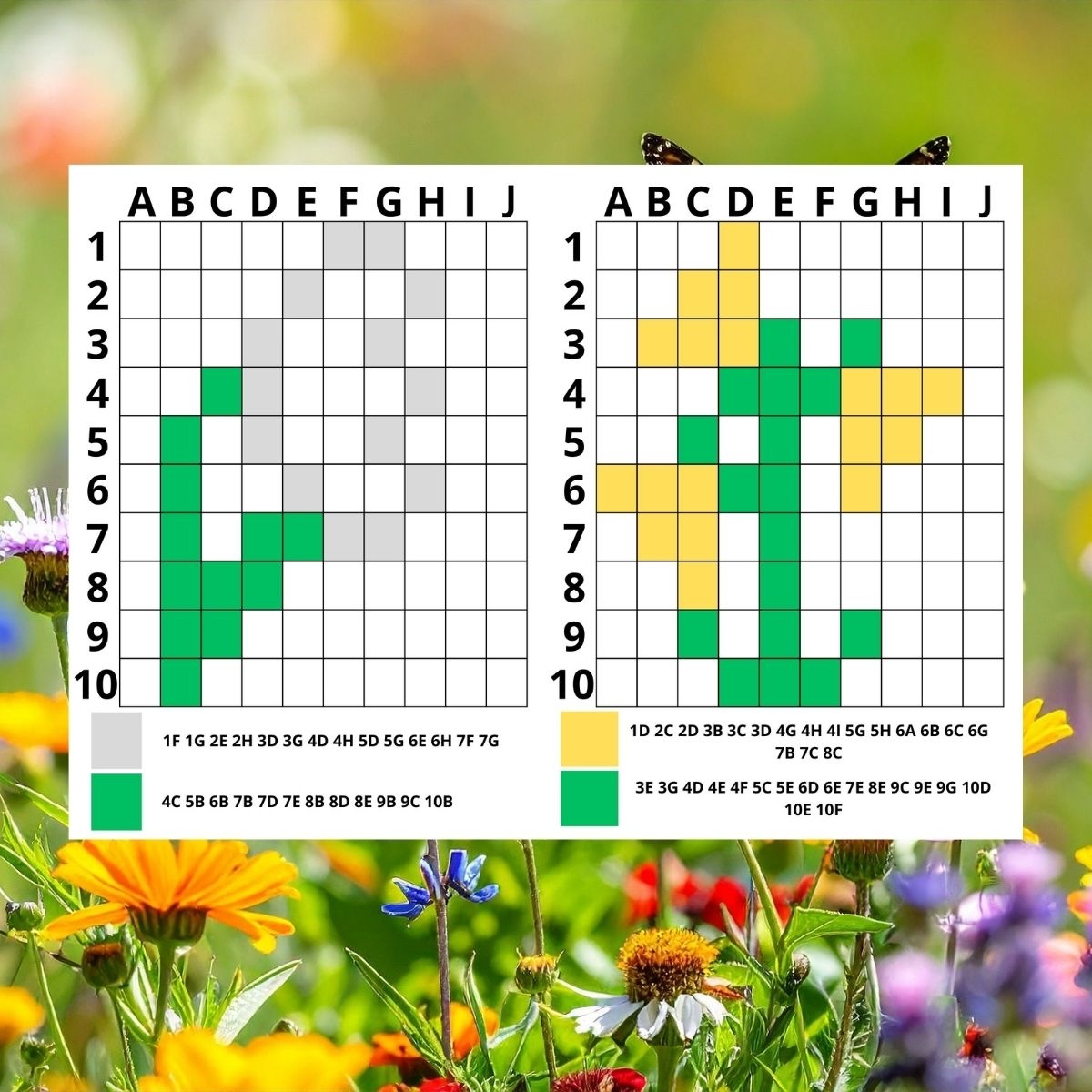 Na kartach z rozwiązaniami pola siatki są pokolorowane tak, aby tworzyły obrazek kwiatu. Pod siatką znajduje się kod kolorów, który wskazuje, jakie pola należy pokolorować.