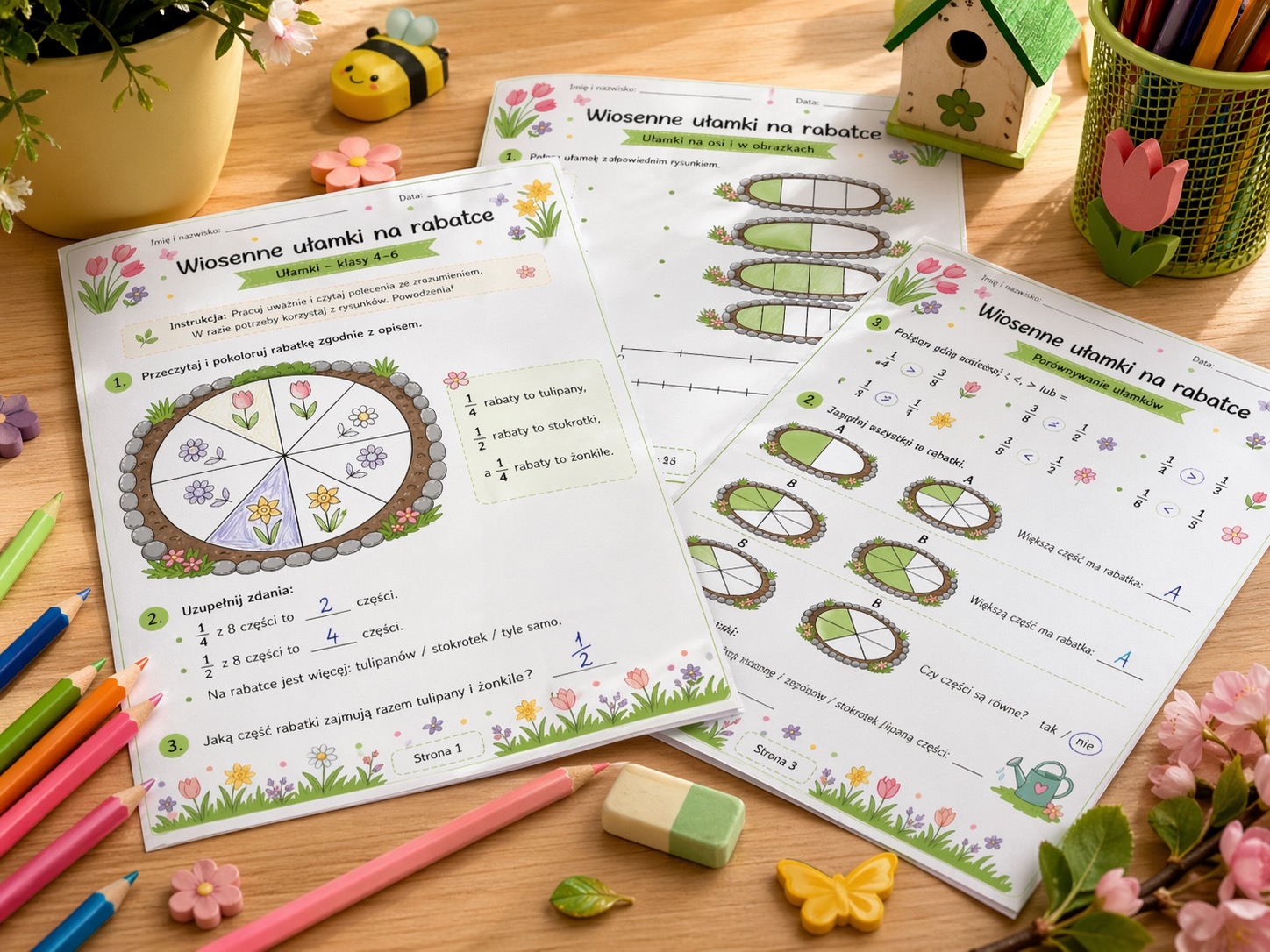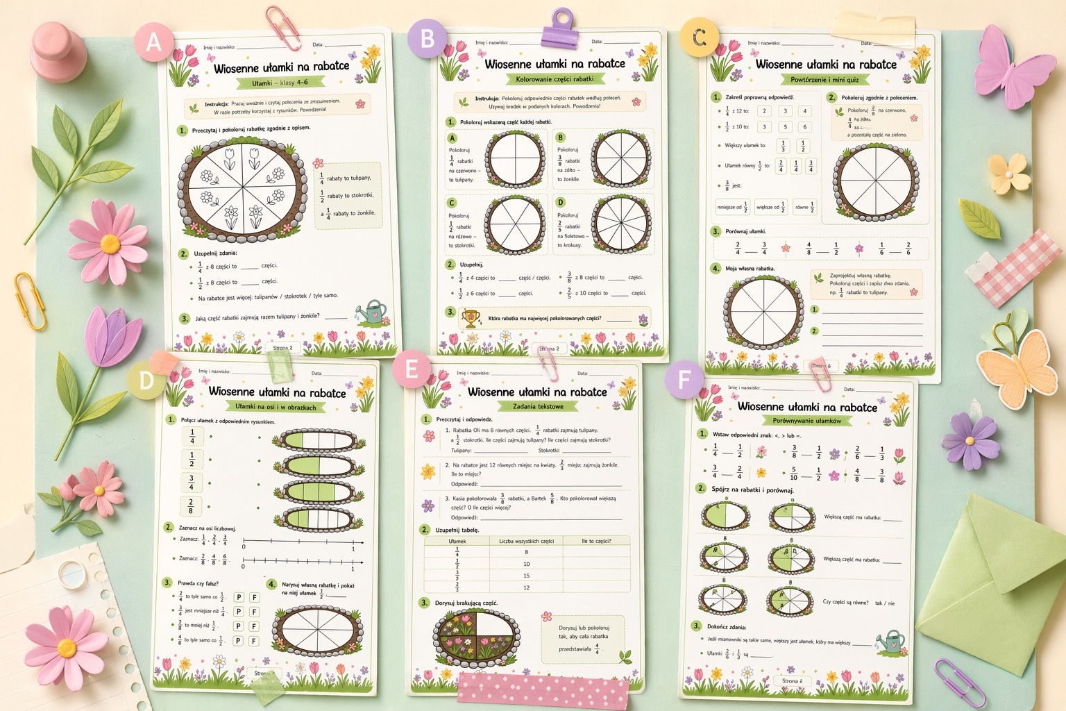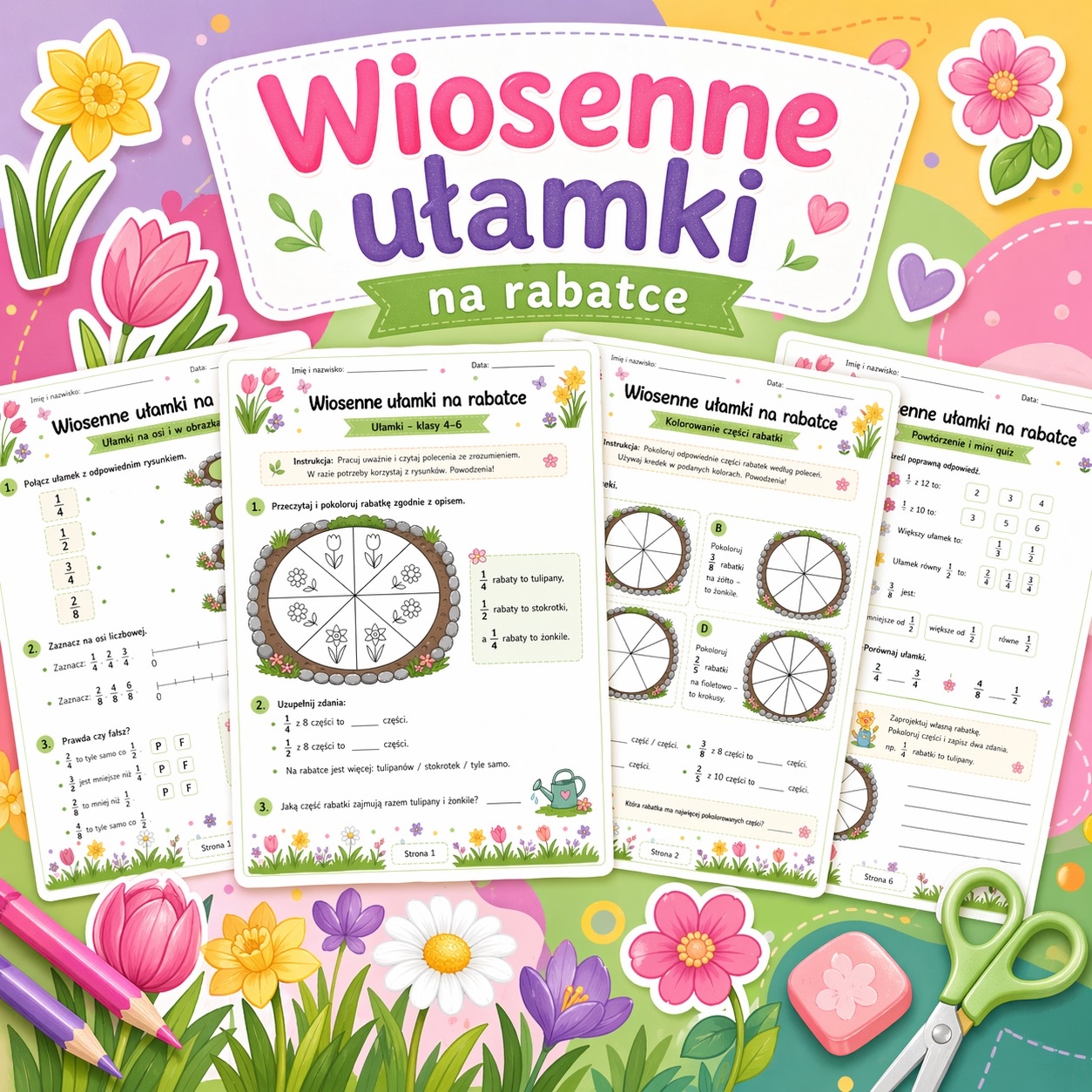 „Wiosenne ułamki na rabatce” to kolorowy, przyjazny dzieciom zestaw kart pracy do nauki i utrwalania ułamków dla klas 4–6. 🌼📚 Materiał zawiera 6 stron z zadaniami opartymi na wiosennych rabatkach i kwiatach, dzięki czemu uczniowie ćwiczą matematykę w atrakcyjnej, lekkiej formie.