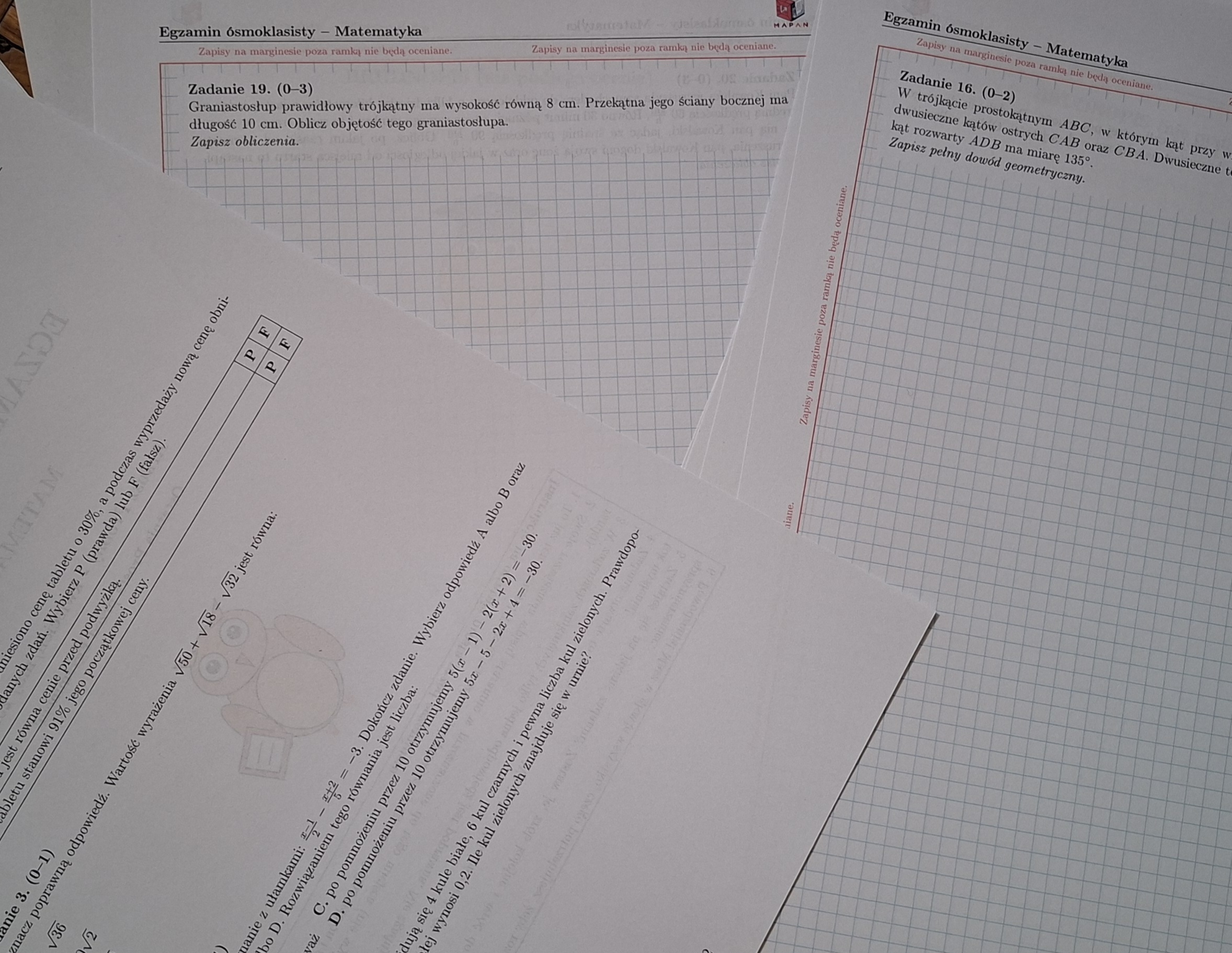 Autentyczny wygląd CKE: To największy atut tego materiału! Arkusze mają dokładnie takie samo formatowanie jak te na prawdziwym egzaminie – zadania otwarte osadzone są na niebieskiej kratce, otoczone czerwoną ramką z ostrzeżeniami na marginesach. To genialny sposób na oswojenie uczniów ze stresem i formatem arkusza.