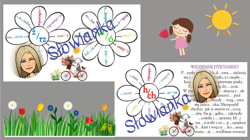 W skład zestawu wchodzą: *wiosenny lapbook - okładka (pani wiosna w ozdobnej sukni oraz napis); - etykiety; - wykreślanka ukryta wewnątrz prezentu; - wiosenne przysłowia w formie harmonijki; - zwiastuny wiosny do zapisania na języku żabki; - kolorowanka wiosenny bukiet ukryta wewnątrz prezentu; - wiosenne zagadki w formie puzzli ukrytych w kopercie; - aparat z przesuwaną kliszą, na której widać wiosenne kwiaty * napis na girlandzie do samodzielnego wydrukowania oraz wycięcia * karta pracy do ćwiczenia ortografii o tematyce wiosennej W płatkach kwiatów znajdują się wyrazy z trudnością ortograficzną u/ó, ż/rz, oraz h/ch. Kartę można wykorzystać na wiele sposobów – może posłużyć jako malowanka, można także powycinać płatki, a zadaniem uczniów będzie doklejenie ich i stworzenie pięknego kwiatu. W karcie pracy znajduje się również krótkie dyktando z lukami o tematyce wiosennej.