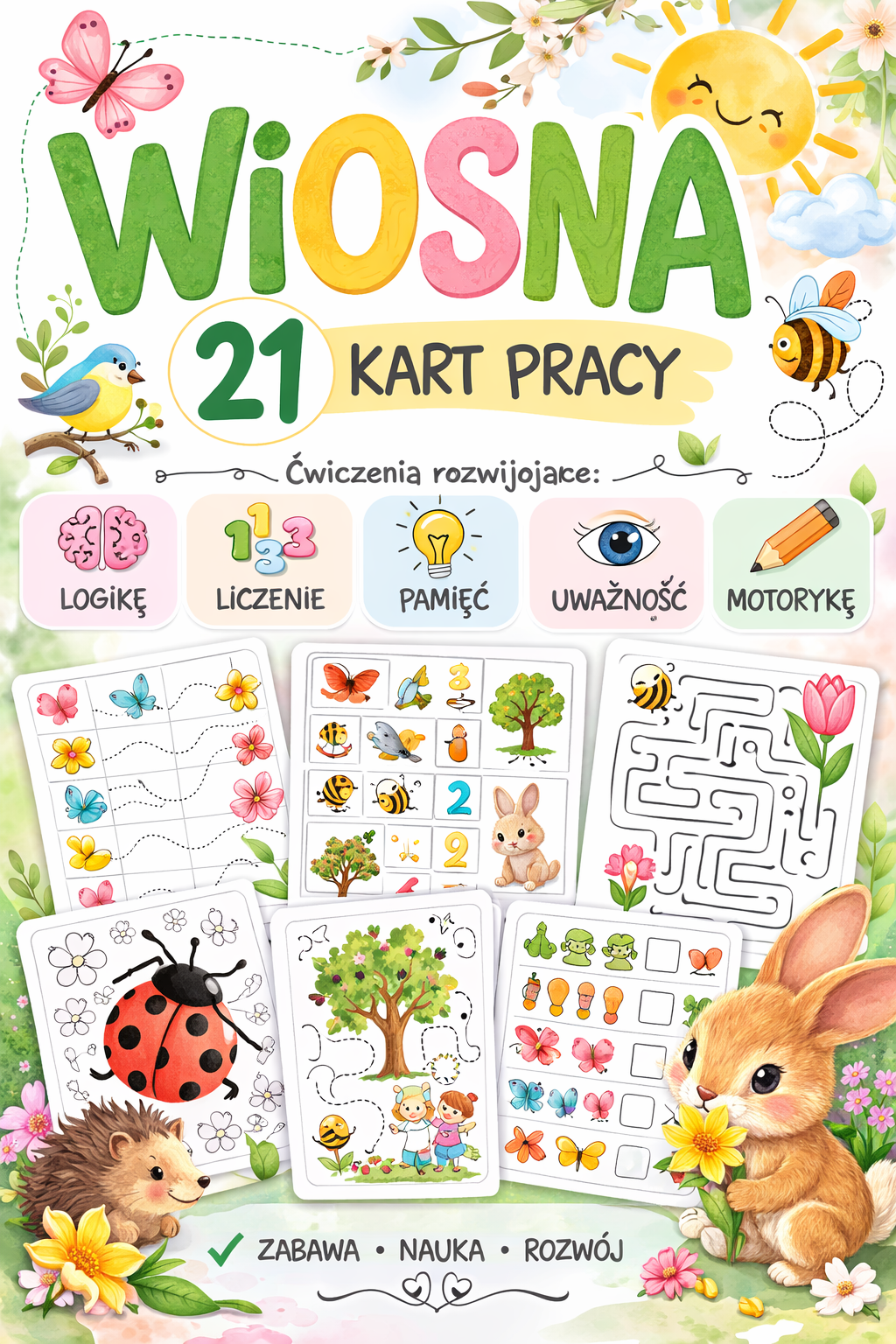 Zestaw wiosennych kart pracy, które w atrakcyjny sposób rozwijają koncentrację, logiczne myślenie oraz umiejętności poznawcze dzieci. Kolorowe ilustracje i różnorodne zadania zachęcają do nauki poprzez zabawę.