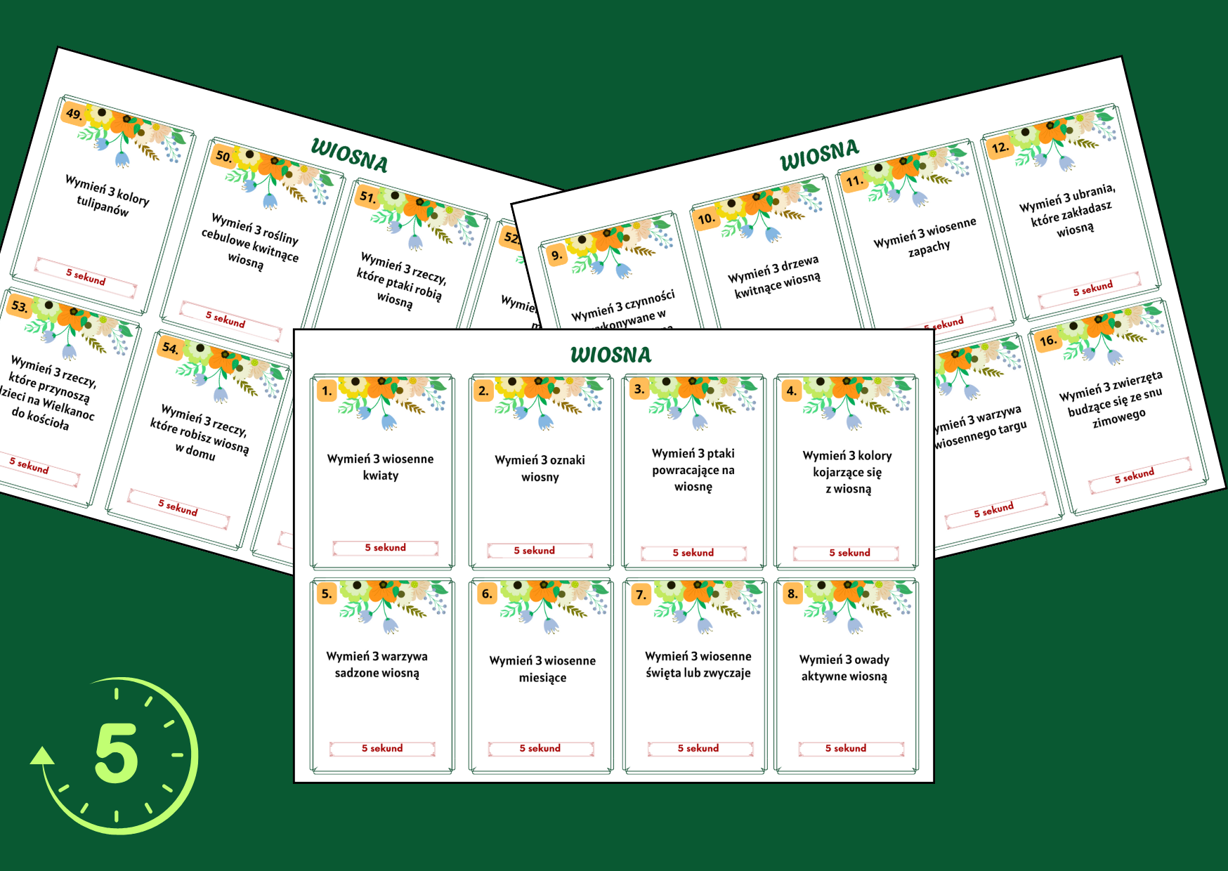 Proponuję inne materiały dotyczące wiosny oraz inne moje gry „5 sekund” (przede wszystkim „polonistyczne”):