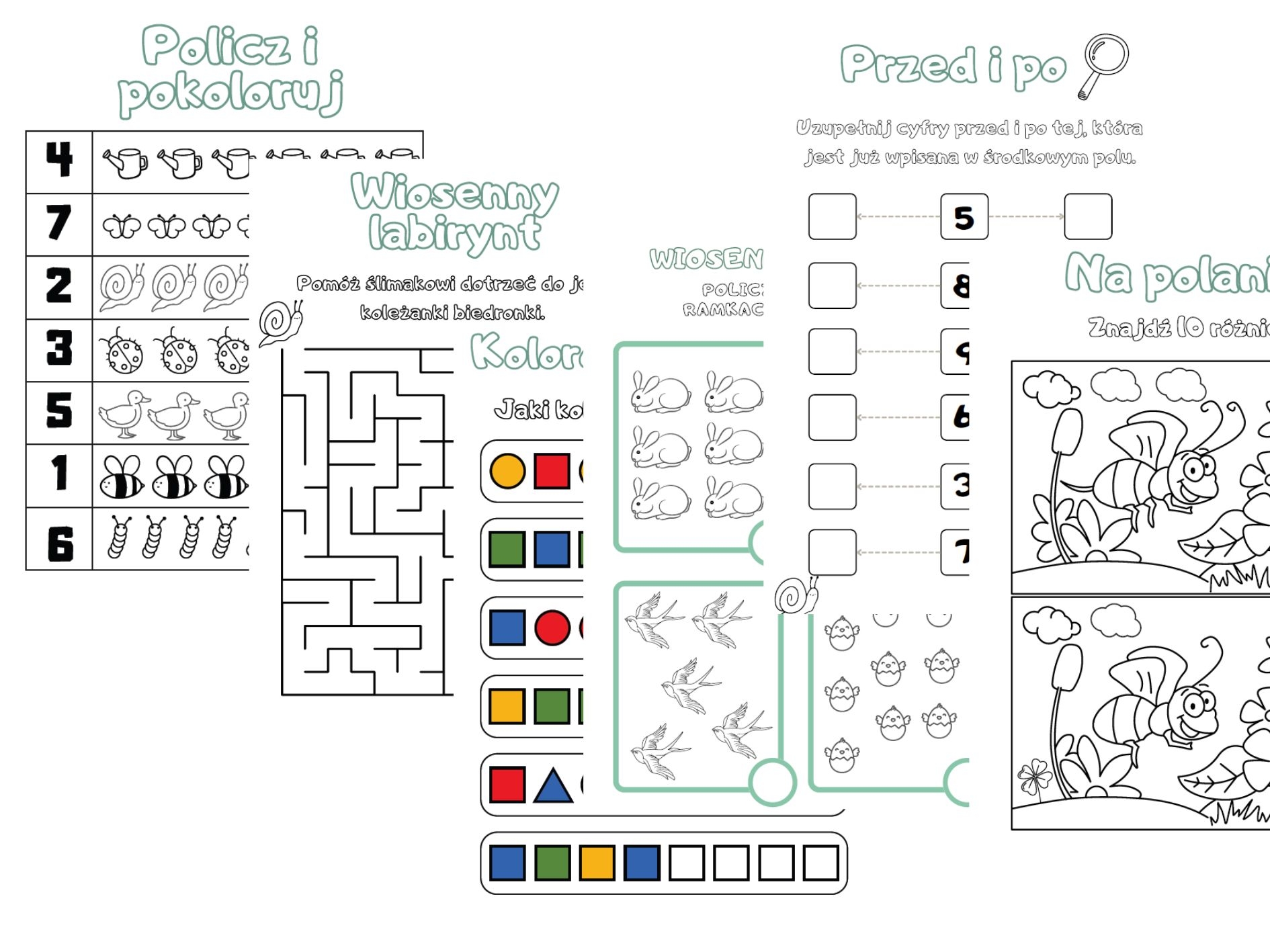 Wiosenne karty pracy dla przedszkolaków: labirynt, znajdź i policz elementy, pokoloruj, kolejność cyfr, znajdź różnice.