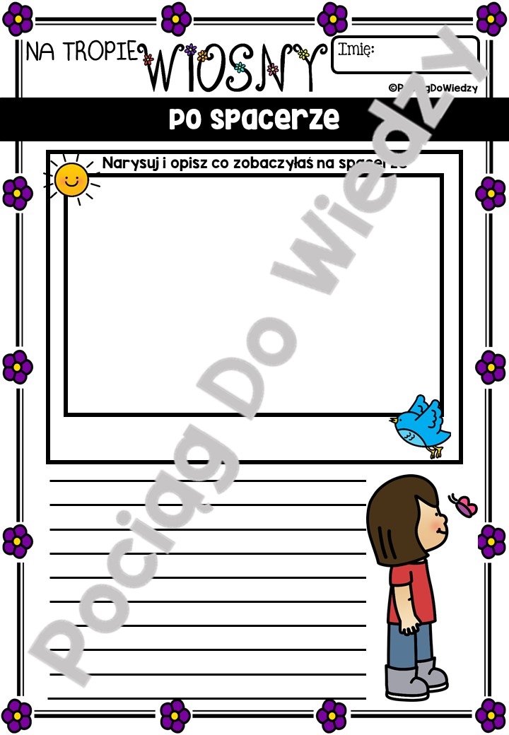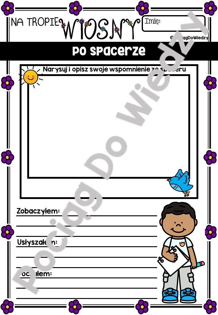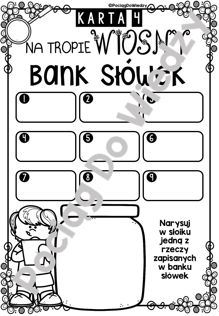 Zabawa dla wszystkich poszukiwaczy przygód i świetny sposób na zajęcia z uczniami na dworze - można ją przeprowadzić w grupie lub przydzielić uczniom karty indywidualnie. Wspaniały sposób nauki o zmieniających się porach roku, spacer przyrodniczy i ćwiczenia umiejętności obserwacji. Wszystkie karty są w wersji kolorowej oraz czarno-białej. Zestaw zawiera: - 6 kart zawierających po 9 elementów do znalezienia na spacerze, w wersji obrazek i obrazek + nazwa; - 1 kartę do wypełnienia – 4 zauważone przez dzieci rzeczy/przedmioty, które nie znalazły się na kartach 1-6; - 6 kart – Bank słówek, do uzupełnienia nazwami rzeczy znajdujących się na kartach 1-6; - 1 kartę do uzupełnienia – 9 rzeczy/przedmiotów zauważonych na spacerze – do narysowania; - 1 kartę do uzupełnienia – 12 rzeczy/przedmiotów zauważonych na spacerze – do napisania; - 1 kartę do uzupełnienia – Kolory wiosny - 6 rzeczy/przedmiotów w różnych kolorach, zauważonych na spacerze – do narysowania; 1 karta do uzupełnienia – 5 zmysłów – Co zarejestrowaliśmy wszystkimi zmysłami podczas spaceru; 1 karta do uzupełnienia – wiosenny alfabet – Rejestracja rzeczy/przedmiotów na każdą literę alfabetu, znalezionych podczas spaceru; 2 karty podsumowujące – Po spacerze - w 2 wersjach, osobno dla dziewczynki i dla chłopca,
