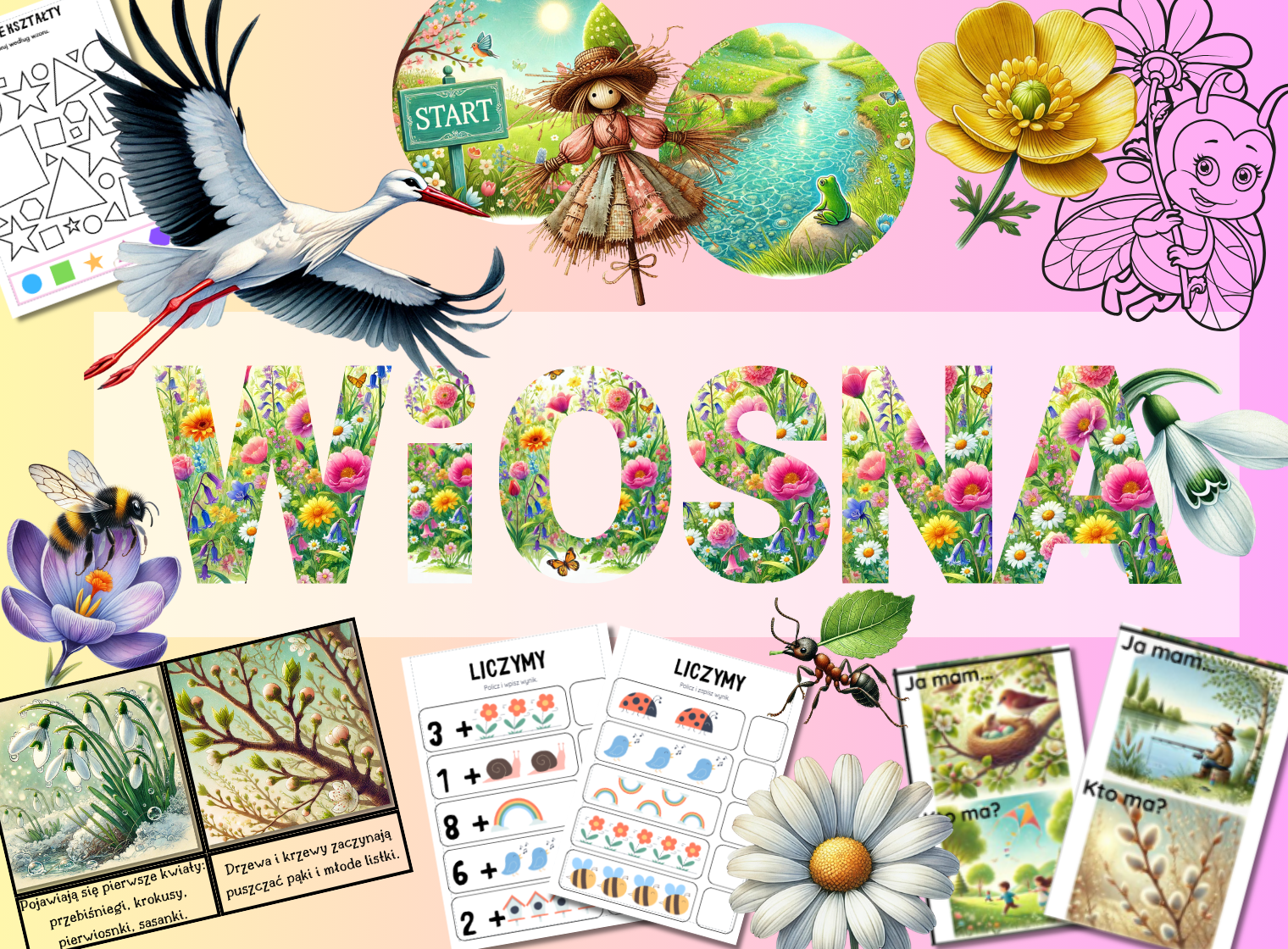 Witaj wiosno! Przygotowaliśmy dla Was wyjątkowy zestaw do druku PDF pełen kolorowych dekoracji, inspirujących ilustracji i angażujących gier.