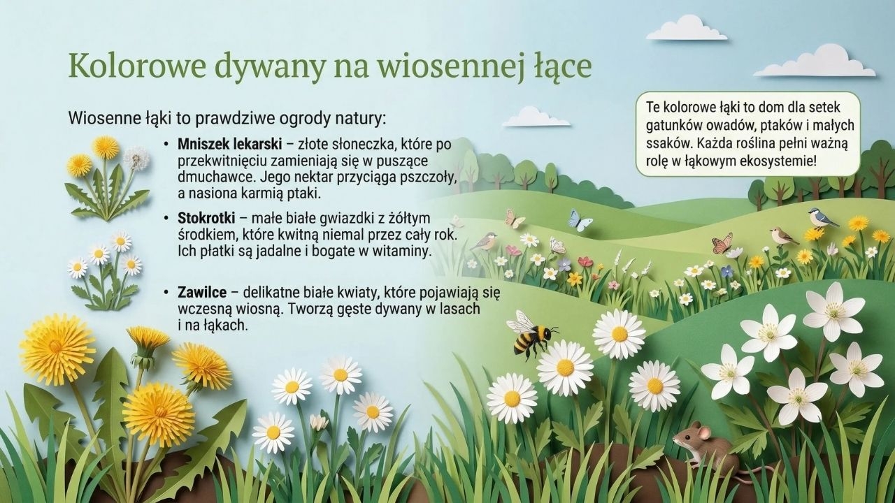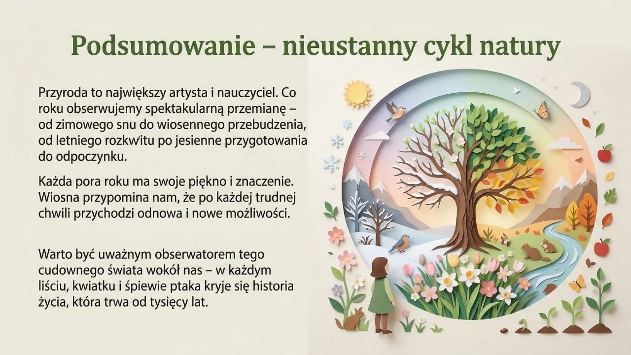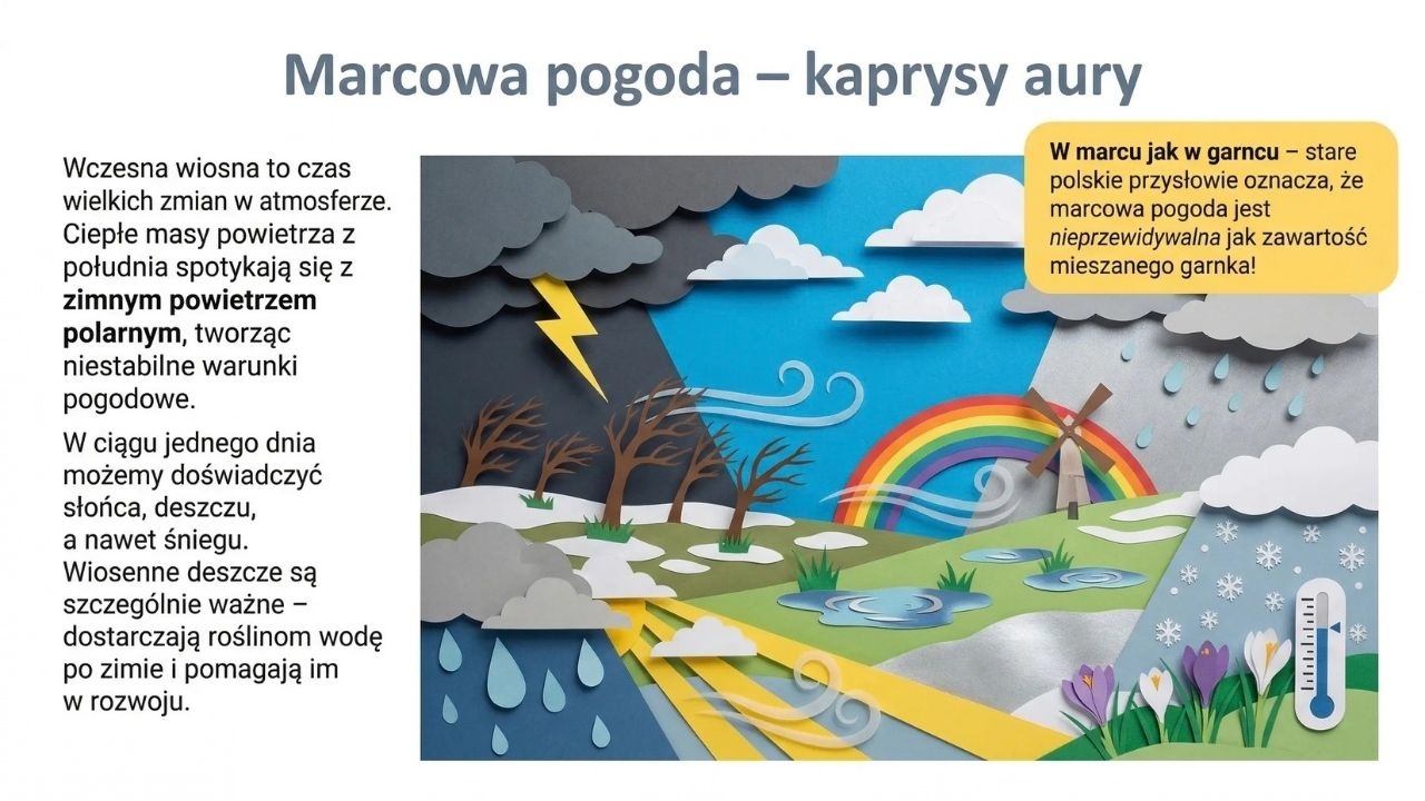 To bardzo estetyczna gazetka szkolna w formie PDF (grafiki jak papierowa wycinanka), która w przystępny sposób pokazuje wiosnę jako czas wielkich przemian w przyrodzie i życiu człowieka. Zestaw zawiera 1 plik PDF i 20 stron/20 plansz. Materiał otwiera okładka „Wiosna” (str. 1), a następnie wyjaśnia różnicę między początkiem wiosny kalendarzowej (1 marca) i astronomicznej (równonoc wiosenna ok. 20–21 marca) (str. 2). Kolejne plansze prowadzą przez wiosenne zjawiska: pierwsze zwiastuny – kwiaty cebulowe (przebiśniegi i krokusy, ciekawostki o „magazynowaniu energii” w cebulkach) (str. 3), budzenie się drzew (krążenie soków, pąki liściowe, bazie wierzby i leszczyny) (str. 4), powroty ptaków wędrownych (bociany, jaskółki, skowronki, żurawie) i dlaczego wracają właśnie wtedy (str. 5) oraz budowanie gniazd i wiosenne śpiewy (str. 6). Materiał pokazuje też owady zapylające i ich rolę (pszczoły, trzmiele, motyle) wraz z ciekawostką o liczbie odwiedzanych kwiatów (str. 7), ssaki budzące się po zimie i pojawianie się młodych (str. 8) oraz marcową pogodę i „kaprysy aury” z nawiązaniem do przysłowia „w marcu jak w garncu” (str. 9). Część praktyczna dotyczy wiosennych prac w ogrodzie i na polu (przygotowanie gleby, siewy, pierwsze warzywa) (str. 10) oraz tradycji pożegnania zimy – Marzanny (str. 11). W zestawie znajduje się również ciekawy wątek przyrodniczo-kulturowy: wielkanocne symbole odradzającego się życia (jajko, zajączek, zielony owies) (str. 12) oraz „kolorowe dywany” wiosennej łąki (mniszek, stokrotki, zawilce) (str. 13). Kolejne plansze omawiają wiosnę w lesie jako „walkę o światło” (rośliny runa leśnego kwitną zanim drzewa się zazielenią) (str. 14), gody płazów i życie w wodzie (str. 15), nowalijki jako „naturalne witaminy” (rzeżucha, szczypiorek, rzodkiewka) (str. 16), burze i tęcze – zjawiska atmosferyczne (str. 17) oraz ważny temat ekologiczny: ochrona przyrody i zakaz wypalania traw (str. 18). Materiał domyka część o wpływie wiosny na nastrój (więcej słońca = więcej serotoniny) (str. 19) i plansza podsumowująca o cyklu natury (str. 20).