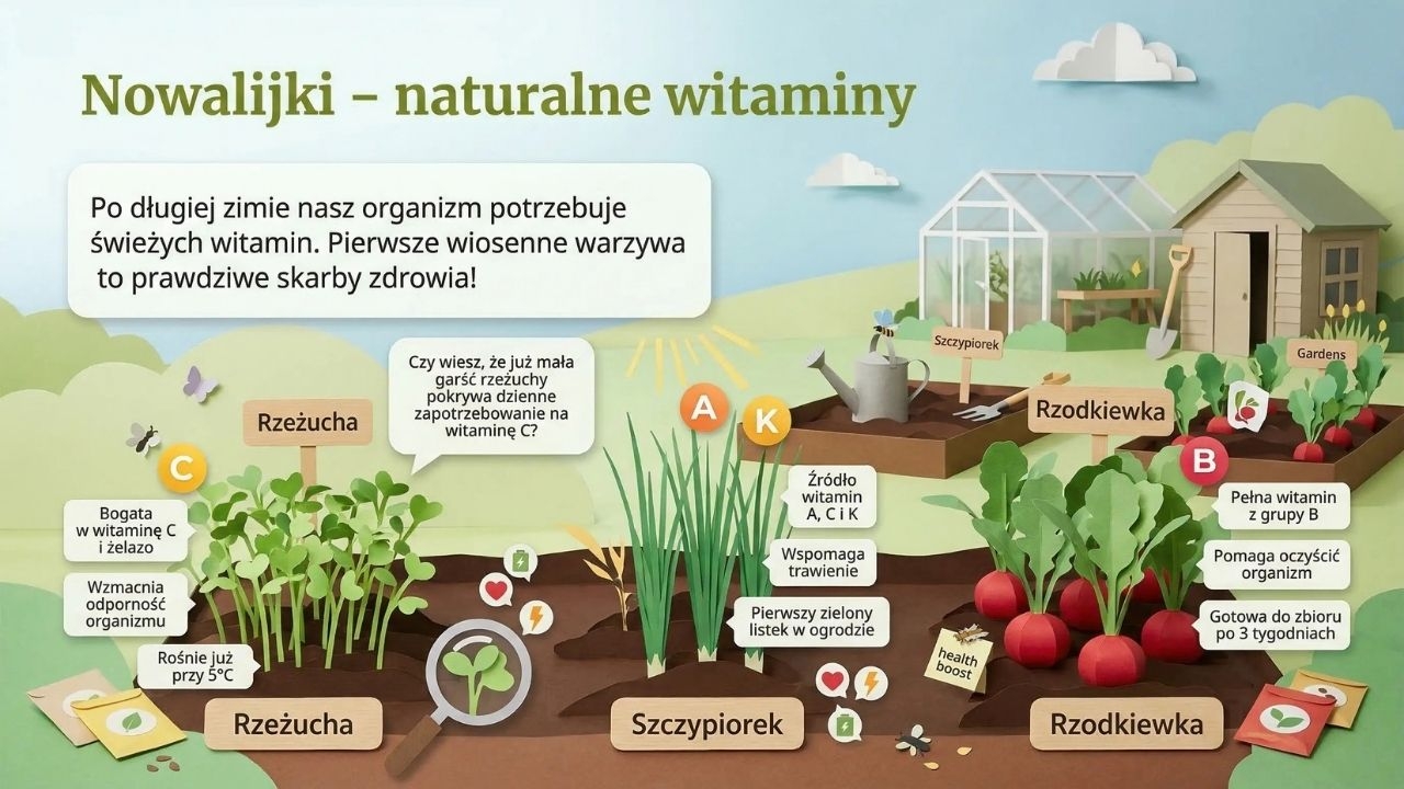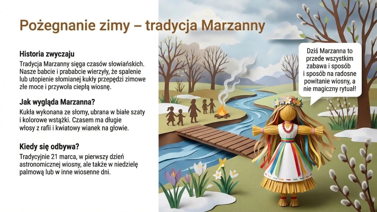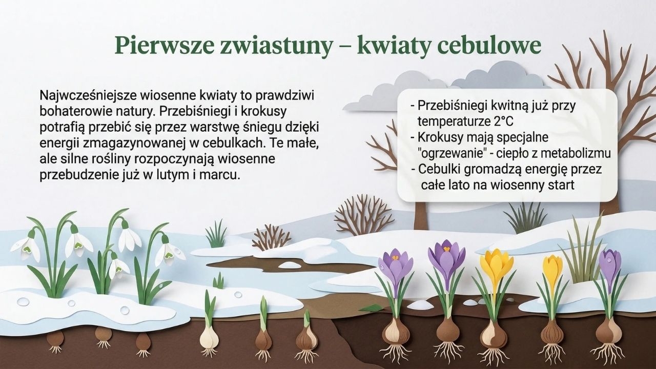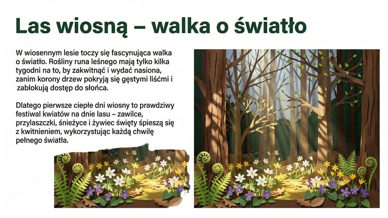 To bardzo estetyczna gazetka szkolna w formie PDF (grafiki jak papierowa wycinanka), która w przystępny sposób pokazuje wiosnę jako czas wielkich przemian w przyrodzie i życiu człowieka. Zestaw zawiera 1 plik PDF i 20 stron/20 plansz. Materiał otwiera okładka „Wiosna” (str. 1), a następnie wyjaśnia różnicę między początkiem wiosny kalendarzowej (1 marca) i astronomicznej (równonoc wiosenna ok. 20–21 marca) (str. 2). Kolejne plansze prowadzą przez wiosenne zjawiska: pierwsze zwiastuny – kwiaty cebulowe (przebiśniegi i krokusy, ciekawostki o „magazynowaniu energii” w cebulkach) (str. 3), budzenie się drzew (krążenie soków, pąki liściowe, bazie wierzby i leszczyny) (str. 4), powroty ptaków wędrownych (bociany, jaskółki, skowronki, żurawie) i dlaczego wracają właśnie wtedy (str. 5) oraz budowanie gniazd i wiosenne śpiewy (str. 6). Materiał pokazuje też owady zapylające i ich rolę (pszczoły, trzmiele, motyle) wraz z ciekawostką o liczbie odwiedzanych kwiatów (str. 7), ssaki budzące się po zimie i pojawianie się młodych (str. 8) oraz marcową pogodę i „kaprysy aury” z nawiązaniem do przysłowia „w marcu jak w garncu” (str. 9). Część praktyczna dotyczy wiosennych prac w ogrodzie i na polu (przygotowanie gleby, siewy, pierwsze warzywa) (str. 10) oraz tradycji pożegnania zimy – Marzanny (str. 11). W zestawie znajduje się również ciekawy wątek przyrodniczo-kulturowy: wielkanocne symbole odradzającego się życia (jajko, zajączek, zielony owies) (str. 12) oraz „kolorowe dywany” wiosennej łąki (mniszek, stokrotki, zawilce) (str. 13). Kolejne plansze omawiają wiosnę w lesie jako „walkę o światło” (rośliny runa leśnego kwitną zanim drzewa się zazielenią) (str. 14), gody płazów i życie w wodzie (str. 15), nowalijki jako „naturalne witaminy” (rzeżucha, szczypiorek, rzodkiewka) (str. 16), burze i tęcze – zjawiska atmosferyczne (str. 17) oraz ważny temat ekologiczny: ochrona przyrody i zakaz wypalania traw (str. 18). Materiał domyka część o wpływie wiosny na nastrój (więcej słońca = więcej serotoniny) (str. 19) i plansza podsumowująca o cyklu natury (str. 20).