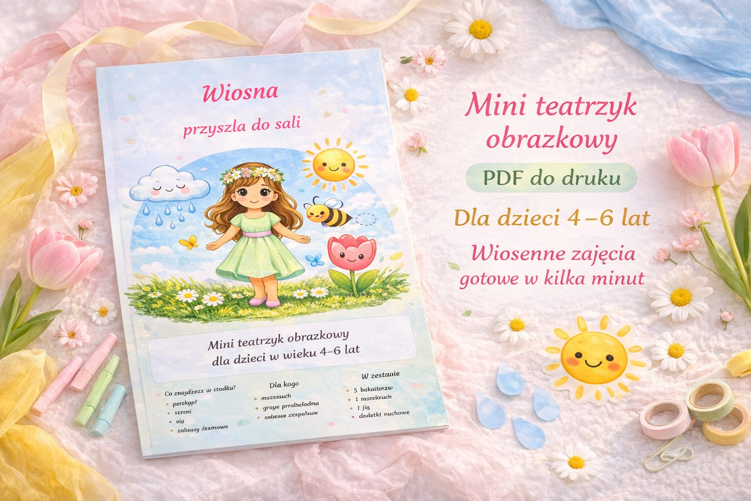To nie jest zwykła karta pracy. To gotowy zestaw do zabawy, ruchu, rozmowy i małego przedstawienia, które dzieci naprawdę pokochają 🐝☀️🌦️🌷