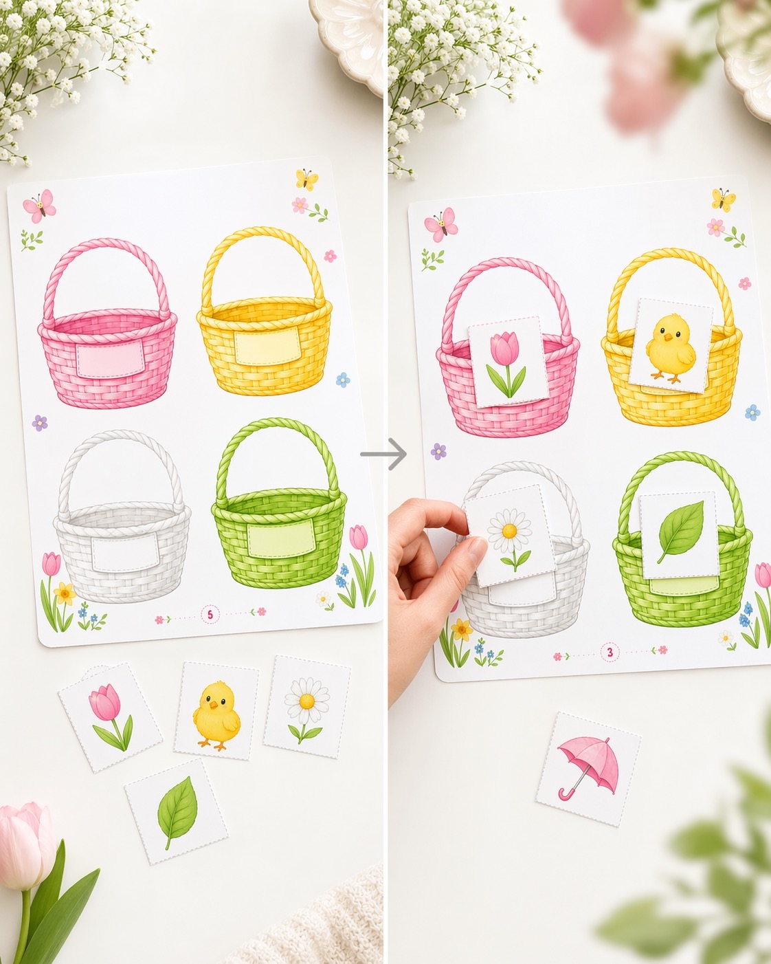 Materiał rozwija spostrzegawczość, klasyfikowanie, koordynację wzrokowo-ruchową oraz małą motorykę. Dzięki wiosennej grafice i przyjaznej formie świetnie sprawdzi się podczas zajęć w przedszkolu, terapii oraz zabaw edukacyjnych w domu. 🧺🌼✂️